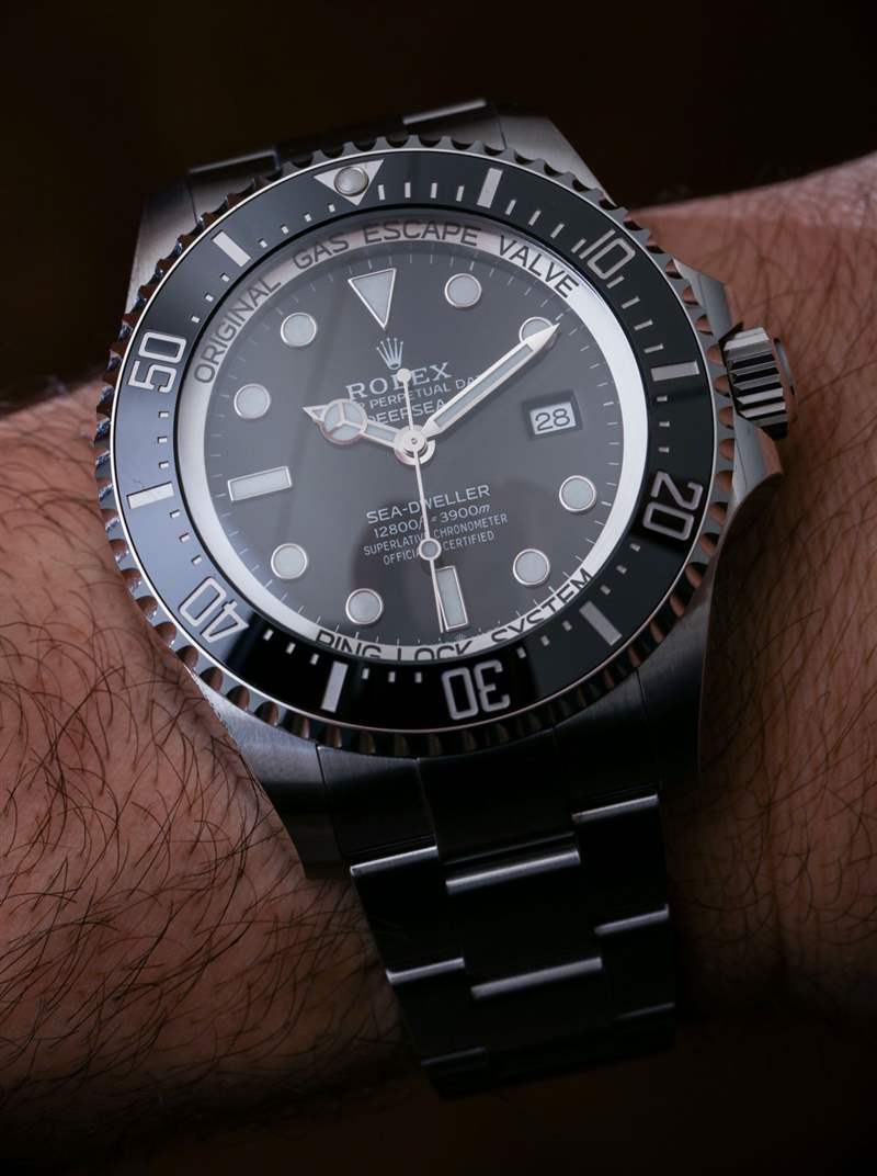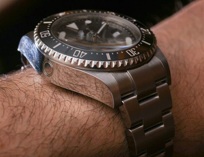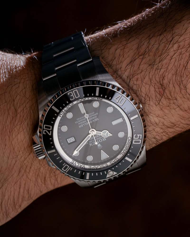 絕大多數佩戴 Deepsea 的人不會把它帶到水下——更不用說接近 13,000 英尺了。勞力士 Deepsea 的防水深度為 3,900 米,這要歸功于真正的類似潛艇的表殼結構。勞力士制造的手表可以走得更深——但除非你發(fā)現自己參加了一場微型、可穿戴的潛水艇小便比賽,否則這幾乎無關緊要。人們傾向于佩戴勞力士 Deepsea 的原因(除了它是一臺非常酷的機器之外)是尺寸。Deepsea 寬 44 毫米,厚度幾乎是 Submariner 的兩倍,是腕間的野獸——但深受粉絲喜愛。