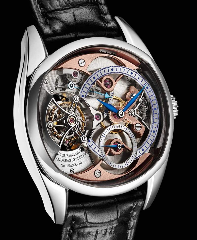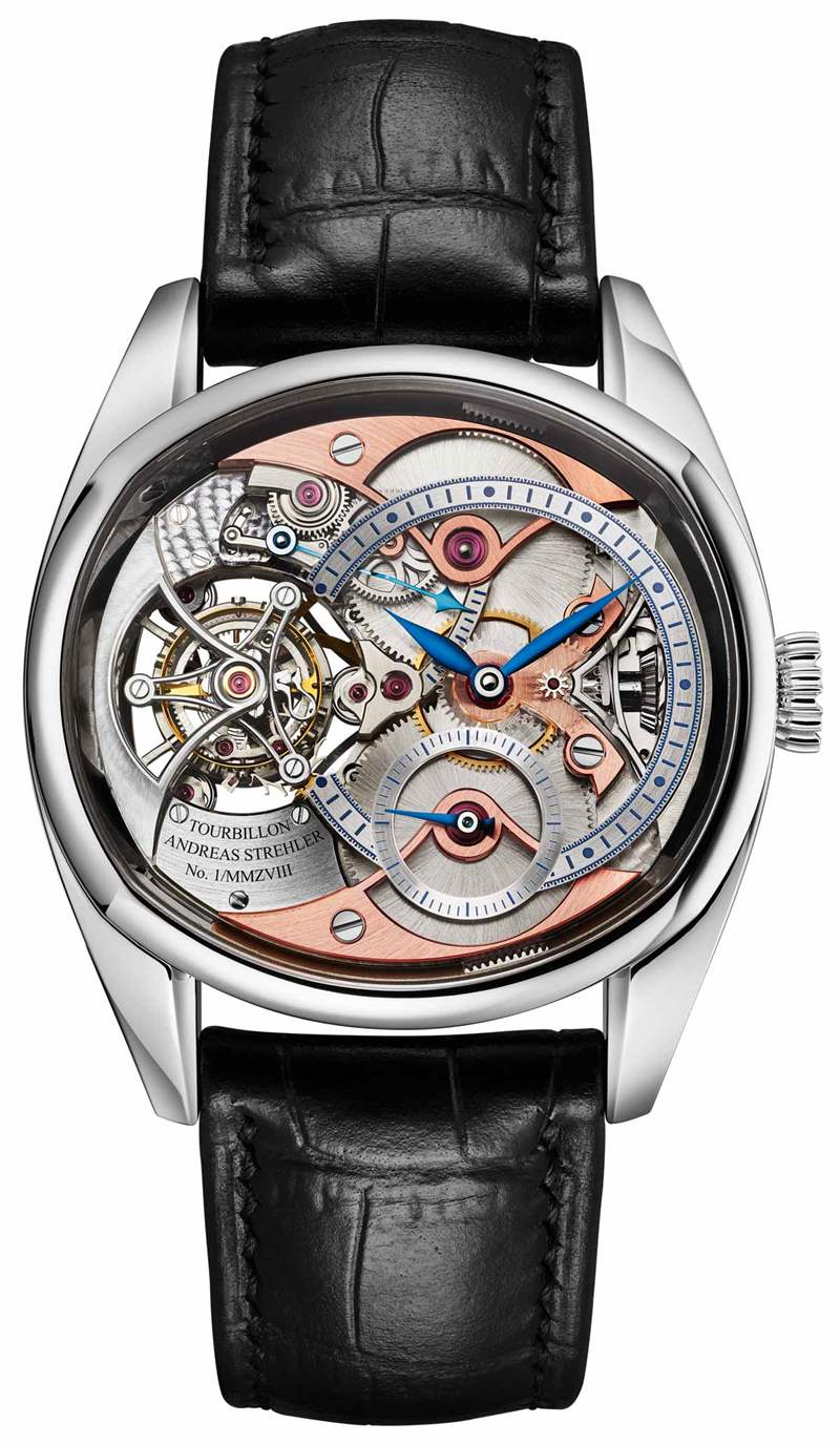 Andreas Strehler Transaxle Remontoir Tourbillon 表殼可以用金或鉑金制成,寬 41 毫米,表耳之間的距離為 47.2 毫米,厚約 10 毫米。優(yōu)雅的半墊形表殼造型經典,柔和的線條與外露機芯的華麗細節(jié)相得益彰。附在表殼上的是一條鱷魚皮表帶。