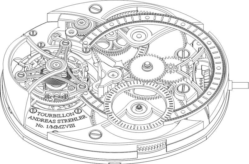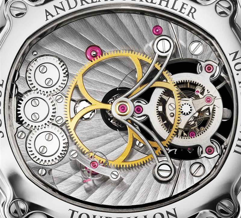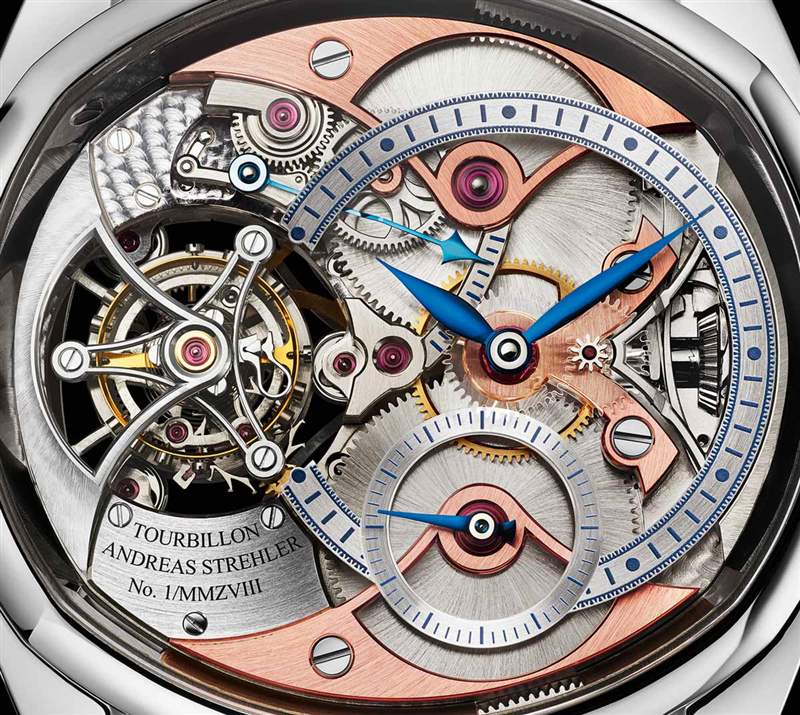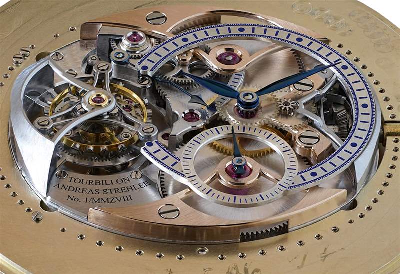 Andreas Strehler 的專長之一是生產非常小的、非常精細的齒輪——特別是錐形齒輪(其中有一些在機芯中)。最明顯的是表冠柄上突出的錐形齒輪,這是上鏈機構的一部分。它是一個非常有效和可靠的系統(tǒng),可以安全地為機芯上鏈。