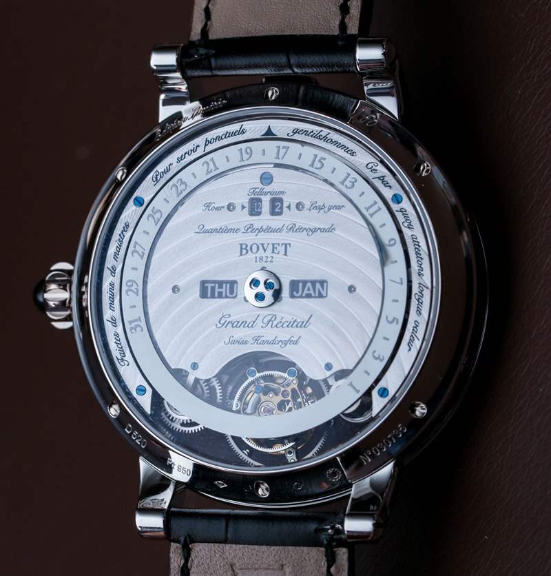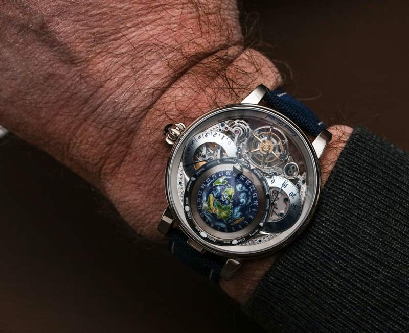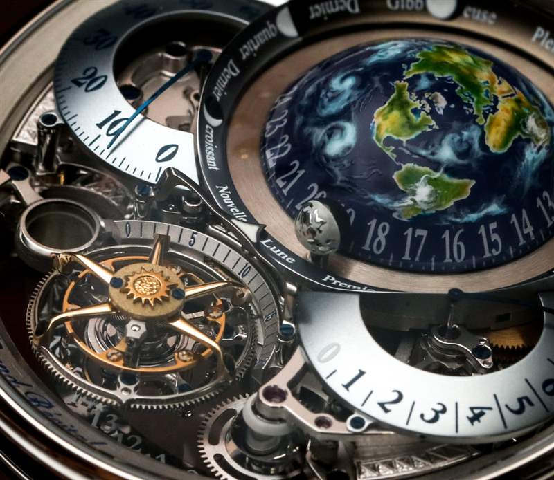 與其他同類時計的情況一樣,手表內(nèi)部的機(jī)械機(jī)芯和表盤之間沒??有明顯的區(qū)別。兩者都連接在一起,因為刻度、刻度盤和其他指示器直接構(gòu)建在機(jī)芯本身上。除此之外,播威 Récital 22 Grand Récital 還大量使用手工精加工、雕刻和繪畫。半成品的地球儀展示很漂亮,而且是手工精心繪制的。繪畫過程中使用的最好的視覺技巧是夜光琺瑯漆的應(yīng)用。播威過去曾嘗試過這種類型的發(fā)光涂料,并取得了巨大成功。您可以在這篇文章中看到一些圖像,說明在 Récital 22 Grand Récital 的表面已適當(dāng)?shù)爻淙胱銐虻墓饩€后,表盤上會在黑暗中發(fā)光。大多數(shù)具有這種傳統(tǒng)風(fēng)格和復(fù)雜性的時計都沒有那種類型的“燈光顯示”來與它的主人分享。話雖如此,告訴時間的系統(tǒng)并不完全是發(fā)光的。手表僅以 24 小時格式顯示時間,小時是夜光的,但不是逆跳分針。