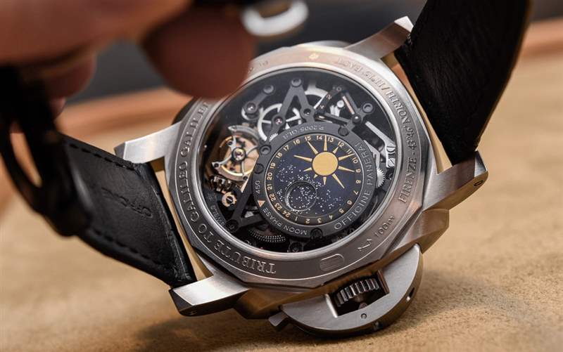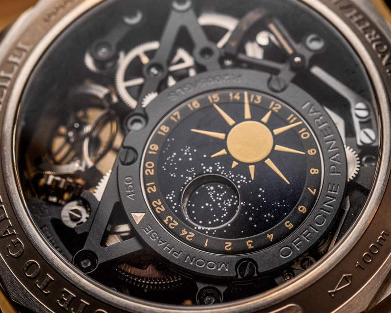 當(dāng)沛納海首次推出 L’Astronomo Tourbillon 時,他們聲稱它的靈感來自伽利略·伽利略(出于明顯的天文原因)。除了時間等式復(fù)雜功能外,從手表的正面看,手表的天文功能并不容易看到。當(dāng)然,表盤外圍還有日出和日落指示器,至少需要復(fù)雜的日歷功能。將 PAM920 背面翻轉(zhuǎn),您會看到這款手表的最新元素之一,即月相指示器——這與之前 2010 年型號的星圖不同。在太陽的對面,月相盤本身非常精美,并且每 24 小時轉(zhuǎn)動一次,作為時間的額外指示。