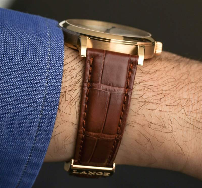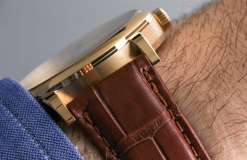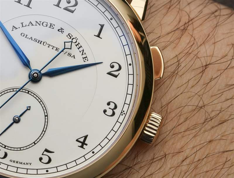 讓我解釋一下跳秒并發(fā)癥。位于表冠上方的按鈕用于啟動和停止中央跳秒針的運動。沒有重置或類似的東西。指針沿著正常的順時針路線開始和停止。名稱的跳躍部分指的是中央秒針“滴答”的事實。這通常被稱為“跳動”秒針,但這個詞并不受歡迎,因為營銷人員不喜歡它。他們也經(jīng)常不喜歡它,因為跳動的秒針也恰好看起來像大多數(shù)石英手表上滴答作響的秒針的運動。話雖如此,1815 Homage to Walter Lange 的表盤確實有一個掃秒針——在小表盤上。
