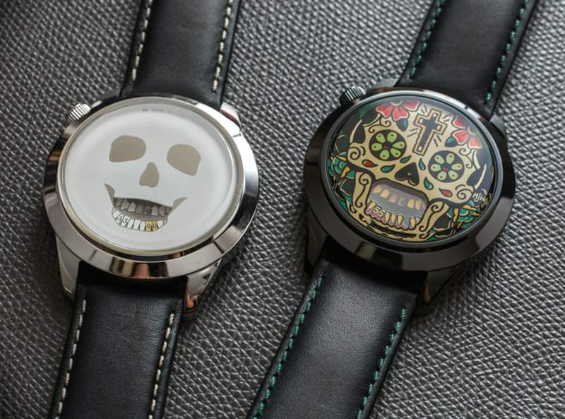 有趣的是 The Last Laugh 和 Last Laugh Tattoo 的比例如何運作良好,這些表盤的尺寸略有增加。兩款手表中比較前衛(wèi)的是Mr. Jones Watches Last Laugh Tattoo XL。這使用了受墨西哥亡靈節(jié)藝術美學啟發(fā)的“彩繪”頭骨。這款腕表采用黑色精鋼表殼,搭配黑色皮革表帶,搭配對比色綠松石色縫線,與表盤的部分色調(diào)相得益彰。