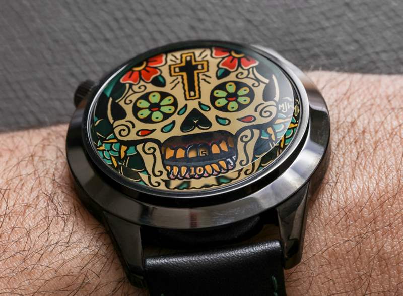 我記得在 2017 年早些時候,他在倫敦的品牌歡迎小店與 Jones Watches 先生的創(chuàng)始人 Crispin Jones 會面。我向他提到的一件事是制造更大版本的手表可能具有的價值。該品牌當時最大的時計為 40 毫米寬——盡管他們的大多數(shù)流行款式仍然只采用該品牌的 37 毫米寬表殼?,F(xiàn)在接近 2017 年底,Mr. Jones Watches 似乎接受了建議,45 毫米寬的 MJW The Last Laugh XL 和 Last Laugh Tattoo XL 就在這里。在手腕上,我覺得我之前的建議得到了驗證,因為我認為這些 XL 手表以更大、更現(xiàn)代的方式捕捉了手表主題的吸引力,這將為新佩戴者打開品牌。