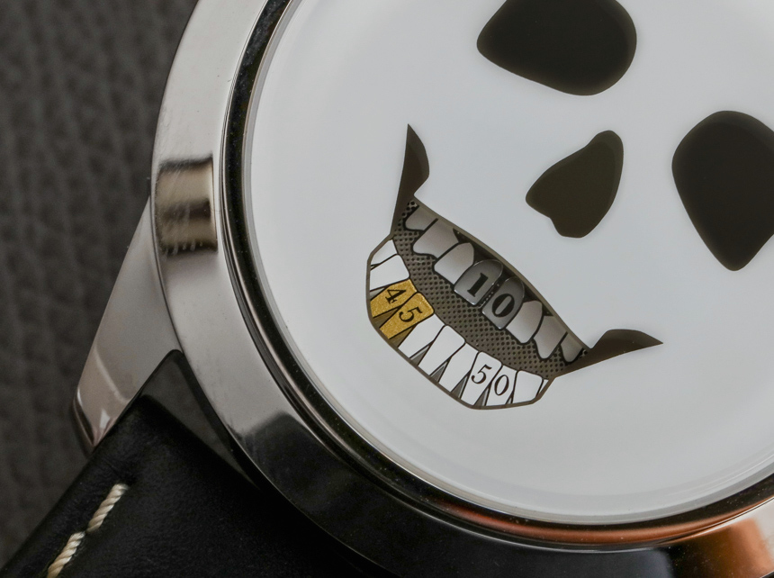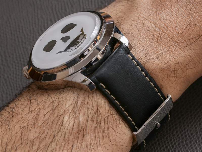 Last Laugh XL 是一款外觀更基本的表盤,只有白色背景下的骷髏特征。小細節(jié)很有趣,例如頭骨眼睛的鏡像。這是兩個型號中我最喜歡的,盡管我不能完全確定我為什么喜歡穿它。我同情“memento mori”(“基于骷髏”物品的哲學理由)的概念,盡管我傳統(tǒng)上不是“骷髏手表”佩戴者。我承認 The Last Laugh XL 在個性方面得分很高,而且也不覺得像一塊便宜的手表。