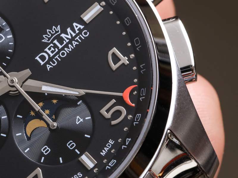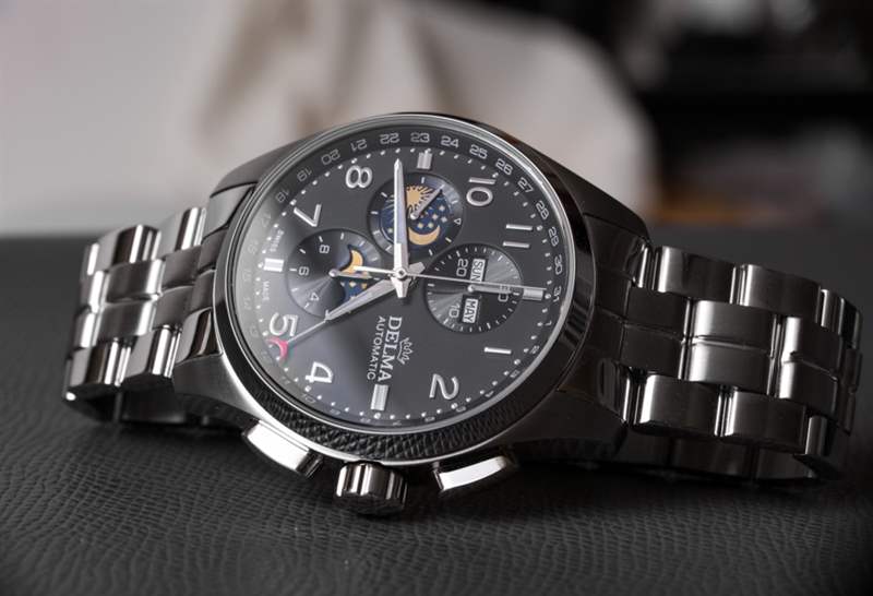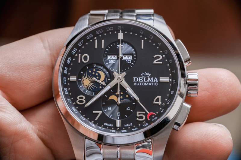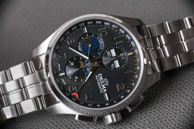 像Delma這樣的手表品牌最適合手表消費(fèi)者,他們不那么追求大公司的名字,而更多地追求專注于特定形式或風(fēng)格的產(chǎn)品。這家總部位于瑞士的公司更多的是以優(yōu)惠的價(jià)格提供瑞士手表體驗(yàn),而不是嘗試新的設(shè)計(jì)和美學(xué)。這使得大多數(shù) Delma 時(shí)計(jì)在外觀上都很保守,該品牌可能認(rèn)為這有助于他們吸引休閑的高端手表愛好者。Delma Klondike Moonphase 是該品牌對(duì)這個(gè)問題的回答;“我們?nèi)绾沃谱鲙в?Valjoux 7751 機(jī)芯的手表?”?結(jié)果是一個(gè)設(shè)計(jì)大雜燴,主要從正裝時(shí)計(jì)世界中汲取靈感,創(chuàng)造出一款具有大量運(yùn)動(dòng)元素的大型手表。