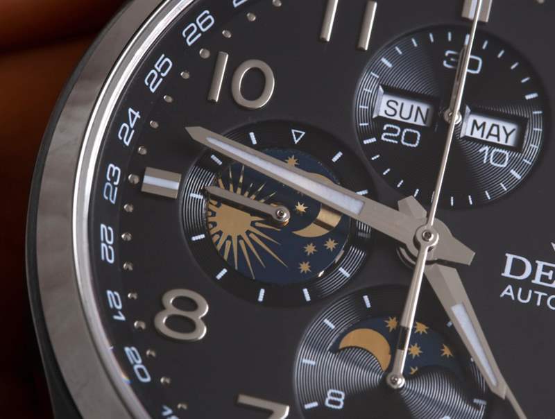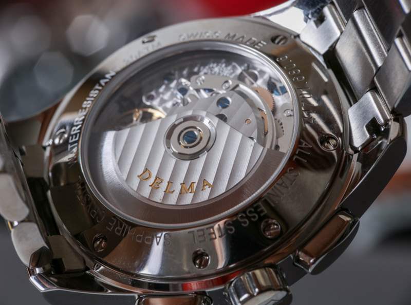 除了用于 24 小時(shí)指示器的圓盤外,Delma 盡最大努力生產(chǎn)一款忠實(shí)地包含瑞士 ETA Valjoux 7751 自動(dòng)完整日歷機(jī)芯的完整和標(biāo)準(zhǔn)功能的時(shí)計(jì)。這本質(zhì)上是一個(gè) Valjoux 7750,但帶有一個(gè)添加日歷系統(tǒng)的模塊。表盤上有一個(gè)星期和月份的小窗口,整齊地放置在頂部的輔助表盤中,還有一個(gè)指針式日期指示器。雖然我有一些基于 Valjoux 7751 的手表并且通常很欣賞它們,但我從來都不是指針式日期的忠實(shí)粉絲。我什至不經(jīng)常看日期,所以讓長手穿過表盤來指示它對(duì)我來說真的不值得。7751 是一款物超所值的機(jī)芯,唯一真正的缺點(diǎn)是它具有完整的年歷,這意味著您需要每年手動(dòng)調(diào)整更多日歷。沒什么大不了。