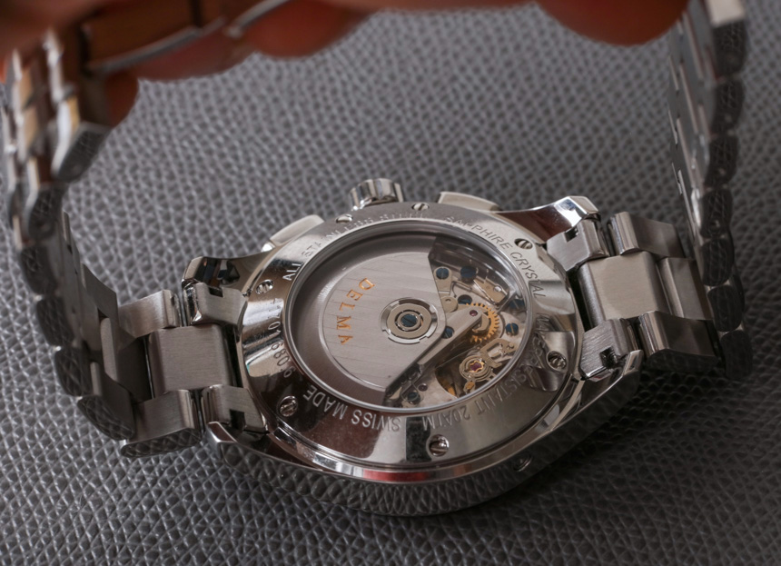 當(dāng)然,該表保留了12小時(shí)計(jì)時(shí)系統(tǒng),該系統(tǒng)源自7750部分機(jī)芯的淵源。除了表冠和表殼右側(cè)的兩個(gè)按鈕外,表殼左上方還有一個(gè)嵌入式按鈕,它是日歷調(diào)節(jié)系統(tǒng)的一部分。自動(dòng)機(jī)芯以 4Hz 的頻率運(yùn)行,動(dòng)力儲(chǔ)存僅超過兩天。您可以通過藍(lán)寶石顯示底蓋查看機(jī)芯。