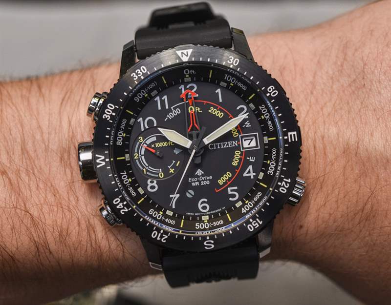 話雖如此,表盤的絕對深度并沒有讓 Altichron 感覺像其他任何東西。表盤需要這么深,因為中心柄需要容納五只手,再加上表盤上的第六只手,用于多功能輔助表盤。您還可以得到日期。據(jù)我了解,這款更新的 Promaster Altichron 的機芯沒有變化,它繼續(xù)包含 Citizen caliber 3290 Eco-Drive 石英機芯。除了時間、指南針、高度計(可以測量高達 32,000 英尺的非常大的部分)和日歷外,表盤還有一個用于電池壽命的動力儲存指示器。