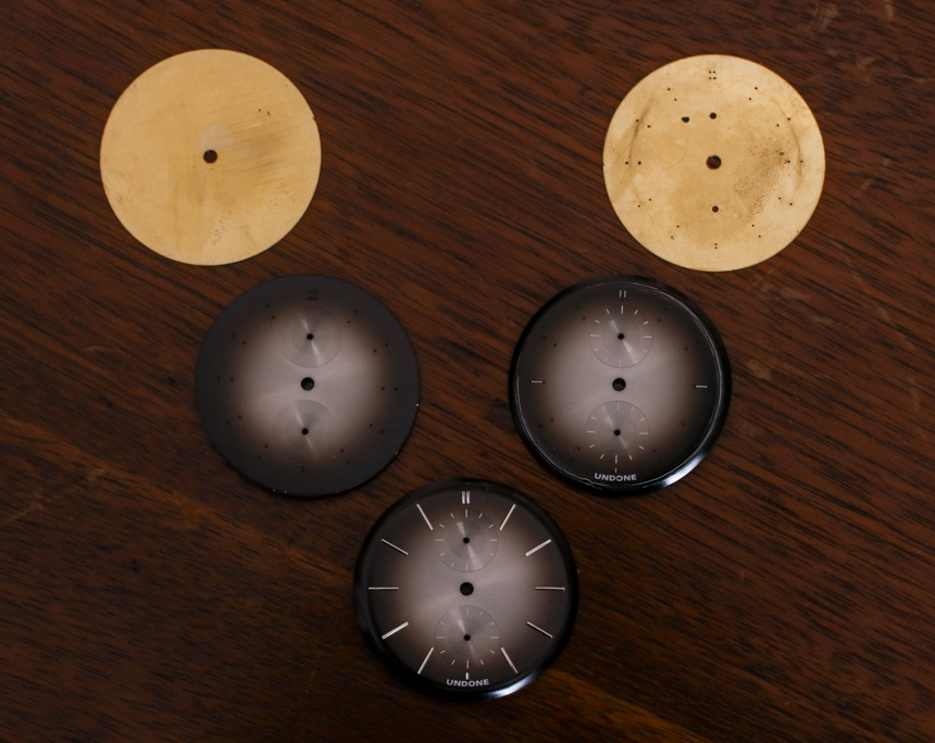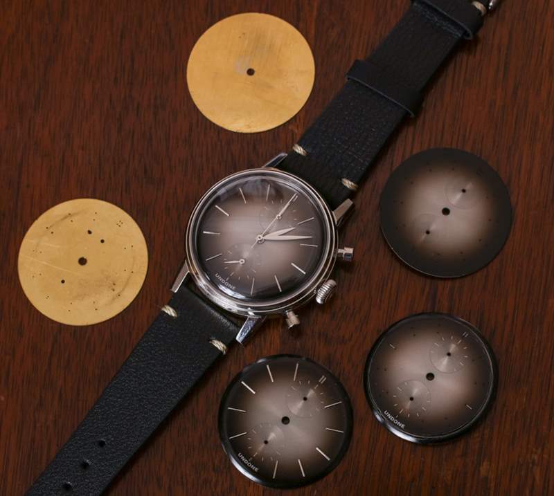 正如您在圖片中看到的,Undone 在五個不同的生產(chǎn)階段分享了一些 Mystique 表盤樣品。你可以看到它是如何從一塊黃銅板開始的,然后在上面印上時標所在的孔,仔細地涂上旭日紋風格的漸變表盤涂漆,墊印有一些指示器,然后添加應用的時標. 這種技術或多或少與高端瑞士手表相同,Undone 似乎不得不提醒收藏家他們?yōu)槿鹗恐圃旄冻隽硕嗌佟?/p>