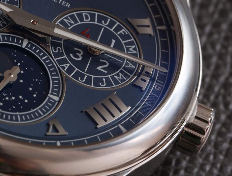 對于最重要的指針,即小時和分鐘指針,易讀性不是問題。時針和分針尺寸完美,進一步受益于夜光材料,與其他表盤元素的光澤色調形成鮮明對比。
