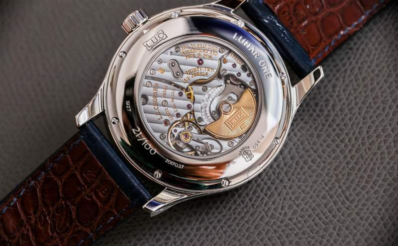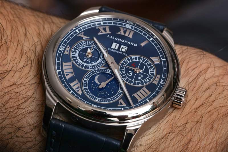 Lunar One 不僅沒有 Perpetual Chrono 表盤上并非所有人都喜歡的副表盤“耳朵”(一種美學的東西),而且還便宜了約 40,000 美元(與鉑金型號相比)。LUC Perpetual Chrono 也是一款更大的手表,表殼寬 45 毫米,而 Lunar One 的表殼尺寸仍然很大(對于正裝表)43 毫米寬。說到尺寸,Lunar One 并不是一只小手表,考慮到寬表耳,對于 43 毫米寬的手表來說,它穿得很大。這不是一件壞事,我知道很多人喜歡這種特殊尺寸的傳統手表。話雖如此,鑒于手表愛好者對他們喜歡的尺寸非常挑剔,如果您對尺寸更適中的正裝手表感興趣,那么在其他地方尋找萬年歷手表(可以說有很多)。