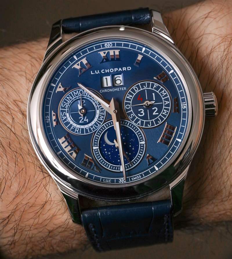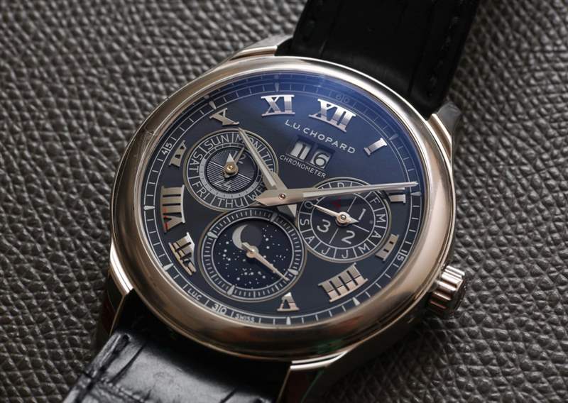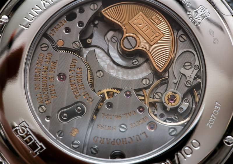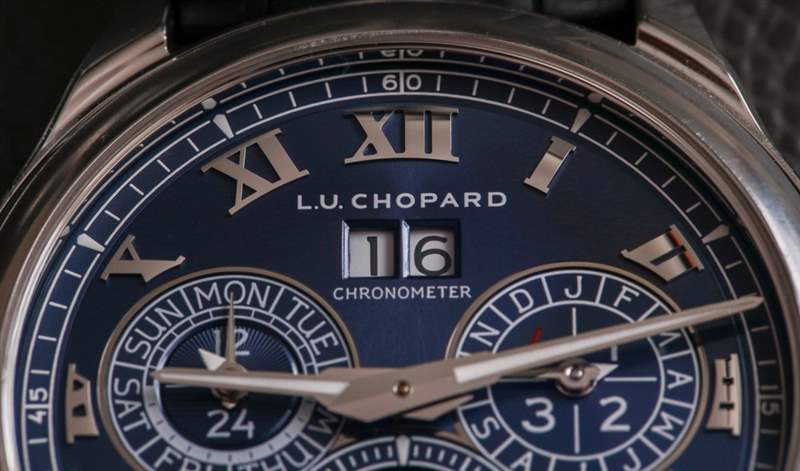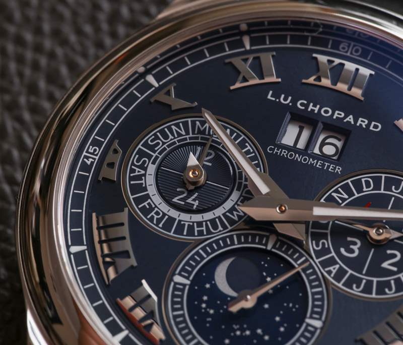 回到對機芯的討論,自動 LUC 96.13-L 以 4Hz(28,800bph)的頻率運行,具有 65 小時的動力儲存,由 355 個零件制成。除時間外,復雜功能還包括萬年歷和 122 年精確月相指示器。日歷系統顯示日期(通過大日期顯示窗口)、月份、星期幾、閏年和 24 小時(日/夜)指示器。表盤的整體布局是合乎邏輯的,在不覺得過于雜亂的情況下盡可能忙碌。我對表盤的唯一問題是,雖然有些子表盤的指針很容易看到,但其他的則不然。例如,其中兩個子表盤的指針較粗,充滿流明,很容易被發現。同時,同樣的表盤也有一個更薄、更拋光的指針,這并沒有從對比色中受益。