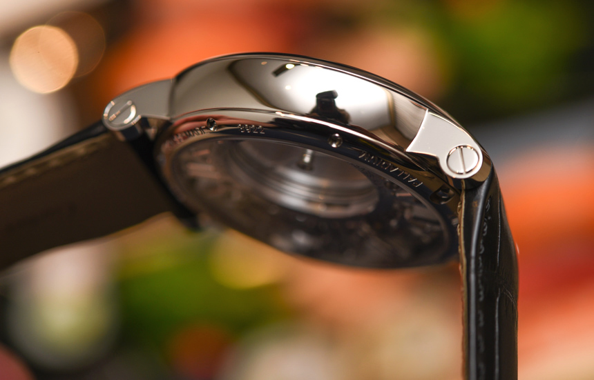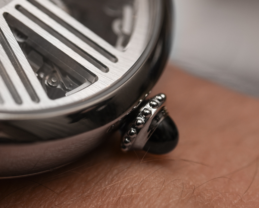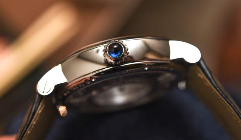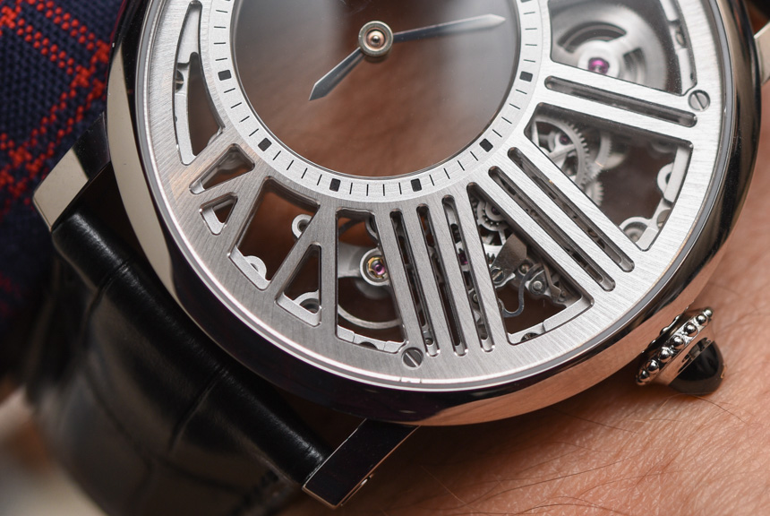 Rotonde de Cartier Mysterious Hour Skeleton 采用 42 毫米寬的鈀色(我相信現(xiàn)在是唯一的),與任何 Rotonde 型號一樣耐磨且舒適。為什么是鈀?好問題; 卡地亞可能想知道您是否發(fā)現(xiàn)這種異國情調(diào)且實(shí)用性有問題的稀有材料是獨(dú)一無二的。圓形表殼帶有一點(diǎn)法國風(fēng)情(盡管它是瑞士制造的),其標(biāo)志性的卡地亞風(fēng)格表冠帶有藍(lán)色藍(lán)寶石水晶凸圓形寶石(請注意,過去卡地亞主要使用藍(lán)色藍(lán)寶石水晶作為凸圓形寶石,只是它更高-如今的終端型號采用藍(lán)寶石,而更多主流型號則采用藍(lán)色尖晶石),以及與表耳相匹配的迷人圓形表圈。