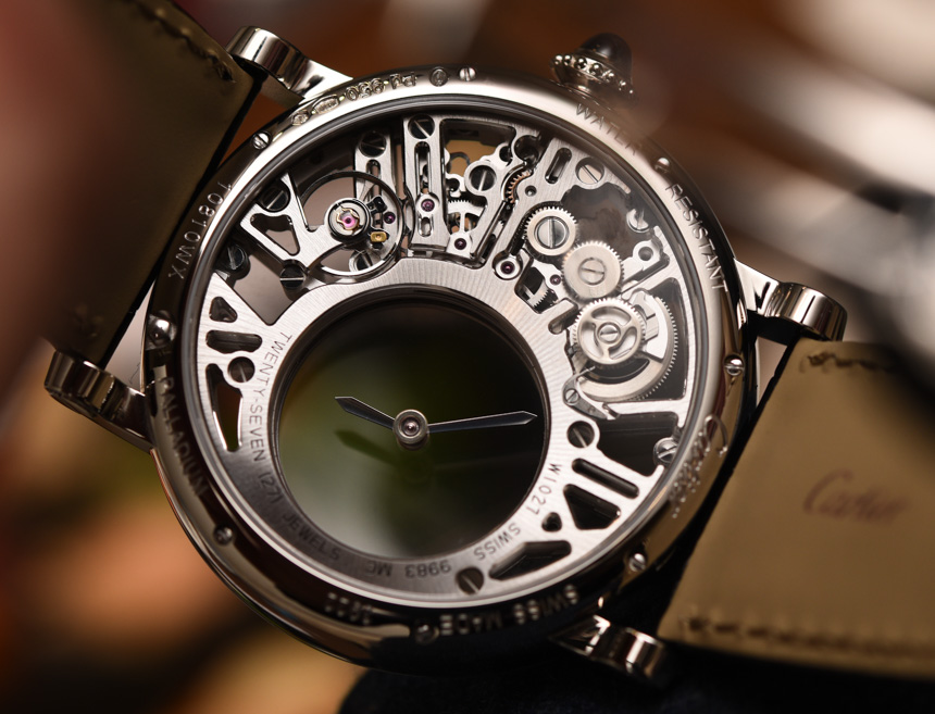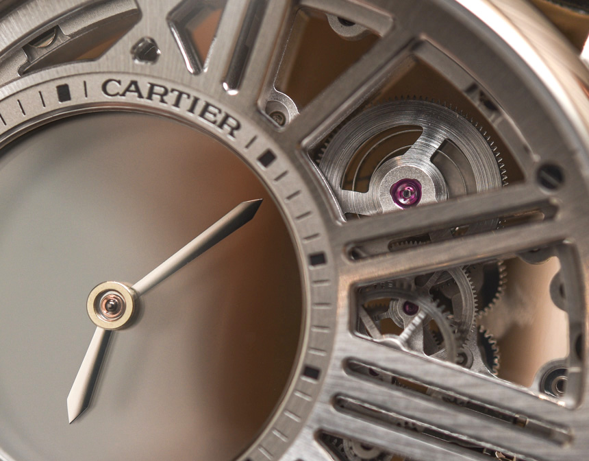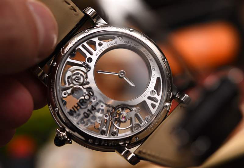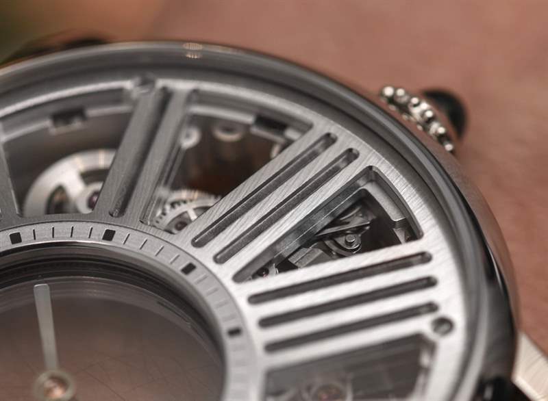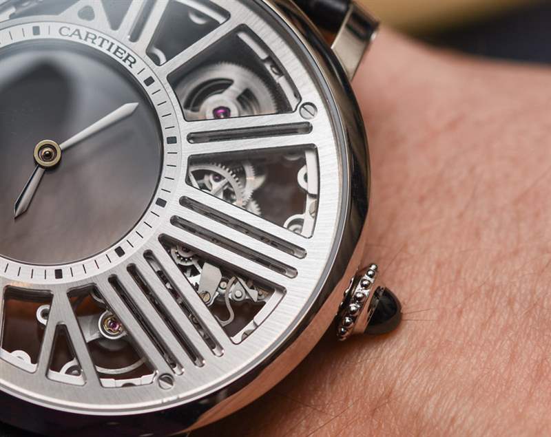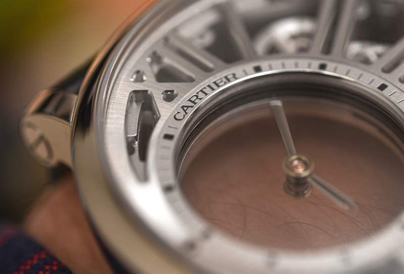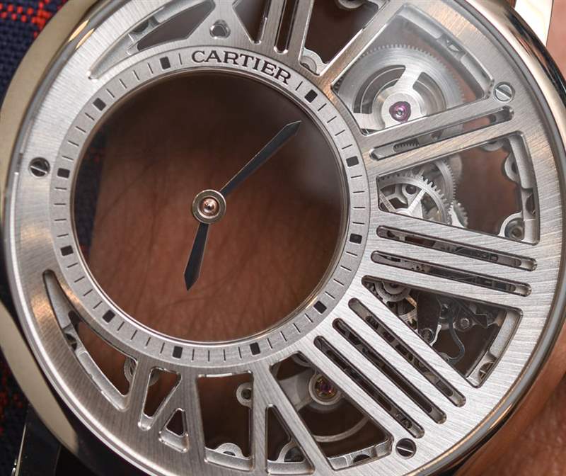 機(jī)芯采用兩塊藍(lán)寶石水晶板,指針置于其上。中間有一個(gè)傳統(tǒng)的安裝系統(tǒng),兩個(gè)藍(lán)寶石水晶圓盤的中心軸點(diǎn)連接。小時(shí)和分鐘表盤右側(cè)的齒輪移動(dòng)這些圓盤,進(jìn)而移動(dòng)指針。構(gòu)成所有這一切的框架,以及機(jī)芯的一部分,是手工完成的盤子,其中包括“結(jié)構(gòu)”羅馬數(shù)字圖案。整體外觀很棒,盡管它不是人們在想象手工完成的機(jī)械表機(jī)芯時(shí)可能會考慮的常見裝飾風(fēng)格。在鏤空表盤和機(jī)芯方面,卡地亞選擇了更現(xiàn)代、可以說是男性化的外觀,因?yàn)樗哂歇?dú)特的美感。