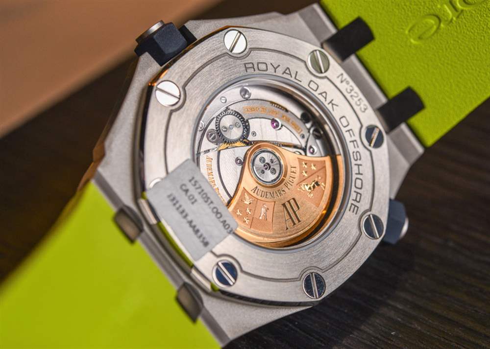 Audemars Piguet Royal Oak Offshore Diver 內(nèi)部裝有 Audemars Piguet calibre 3120 自動(dòng)機(jī)芯。它以 3Hz (21,600bph) 的頻率運(yùn)行,動(dòng)力儲(chǔ)存為 60 小時(shí)。這些總是具有可愛的修飾和裝飾程度,愛彼保持了 300m 的防水性能,同時(shí)提供了藍(lán)寶石水晶顯示底蓋,可以看到機(jī)芯和鐫刻 22k 金轉(zhuǎn)子。