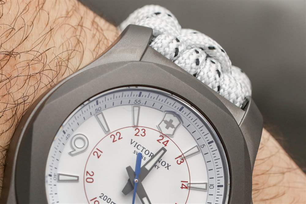 INOX Sky High 提供軍用風格的白色碳纖維表盤,單獨搭配帶斑點的白色傘繩表帶(包含對位芳綸纖維 – 顯然比鋼強 8 倍)。在盒子里,你還會得到一條白色橡膠表帶(帶有藍色和紅色表帶環,有點酷),以及一把帶有傘繩附件的限量版小型瑞士軍刀。根據 Victorinox 的說法,我對這個系列的唯一抱怨是無法真正幫助的。基本上它與傘繩帶的底面是黑色織物而其余部分是白色的事實有關。這并不可怕,但如果搭配白色會更好。