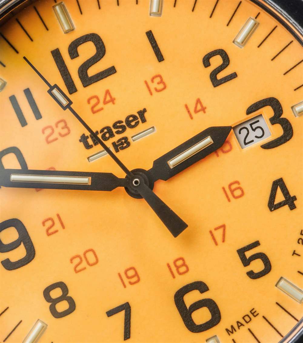表盤結合了 Taser 對氚氣管的典型使用,以及用于黑暗照明的 Super-LumiNova。三只手各有氣管,還有時標。另請注意 12 點鐘下方徽標中的兩個氣管。Traser 說,這些用于幫助在黑暗中確定表盤的位置,以便您可以更輕松地讀取時間——這是一件好事。表盤的其余部分涂有綠色或橙色 Super-LumiNova。這與黑色指針和阿拉伯小時數(shù)字形成鮮明對比。
