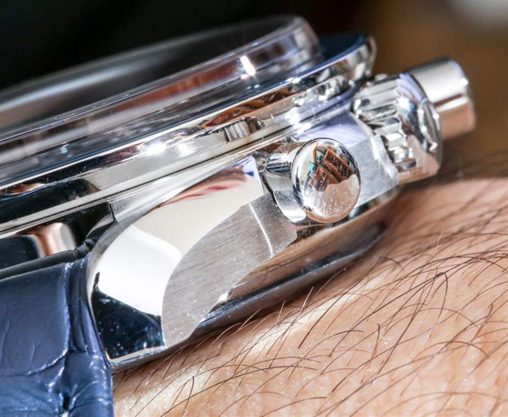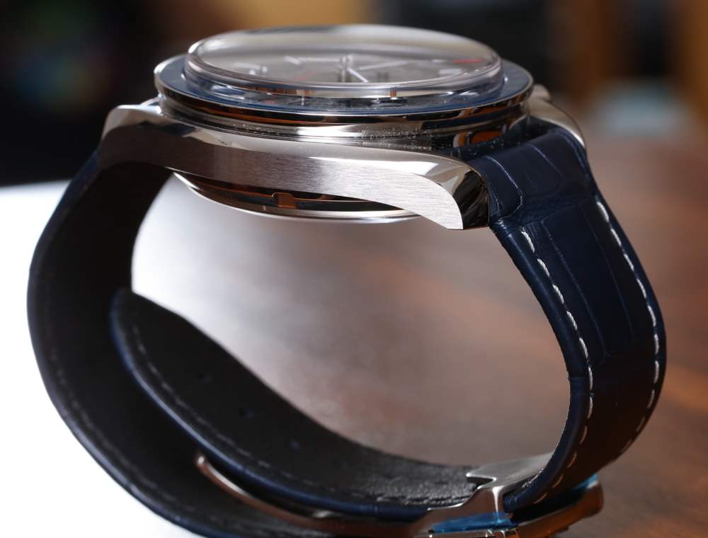 這款特別參考 304.33.44.52.03.001 版本的腕表采用精鋼材質,搭配藍色皮革表帶。您還可以在表帶上使用更經典的黑色表盤,或者在更“傳統的 Speedmaster”鋼金屬表鏈上購買同樣的手表。表殼寬 44.25 毫米,較厚的一側肯定有 16 毫米左右。這款新一代 Speedmaster 表殼很容易成為我所知道的最有趣的“經典風格”表殼之一。我之所以這么說,不僅是因為它的構造方式,還因為從不同的角度觀察它可以極大地改變它的外觀,這是我以前從未在任何手表上體驗過的方式。