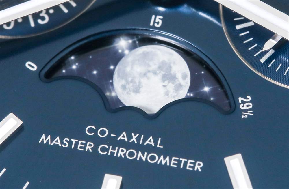 后兩種元素都存在于歐米茄超霸同軸至臻天文臺月相腕表中,但布局不同。在這里,6 點鐘位置(通常是日期所在的位置)相對空曠的空間用于放置傳統的月相指示盤,以栩栩如生地再現月亮。左側表盤有日期指針和運行秒針。右側子表盤仍用于測量計時分針和小時(主表盤上的中央指針仍處理計時秒針)。