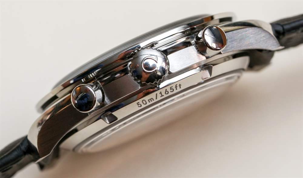 通過(guò)現(xiàn)在更圓潤(rùn)的藍(lán)寶石水晶底蓋可以看到 9900 系列自動(dòng)機(jī)芯。它以 4 赫茲(28,800 次/小時(shí))的頻率運(yùn)行,高于之前一些同軸擒縱 Omega 機(jī)芯的 3.5 赫茲。擒縱系統(tǒng)采用硅游絲,兩個(gè)主發(fā)條盒之間的動(dòng)力儲(chǔ)存為 60 小時(shí)。該機(jī)芯具有帶小秒盤的時(shí)間,以及一個(gè)完整的 12 小時(shí)計(jì)時(shí)碼表,計(jì)時(shí)碼表分針和時(shí)針位于同一個(gè)(右)子表盤中。6點(diǎn)鐘有日期。該機(jī)芯既獲得了 METAS 認(rèn)證,也獲得了 COSC 天文臺(tái)認(rèn)證,盡管前者的認(rèn)證使后者或多或少顯得多余。