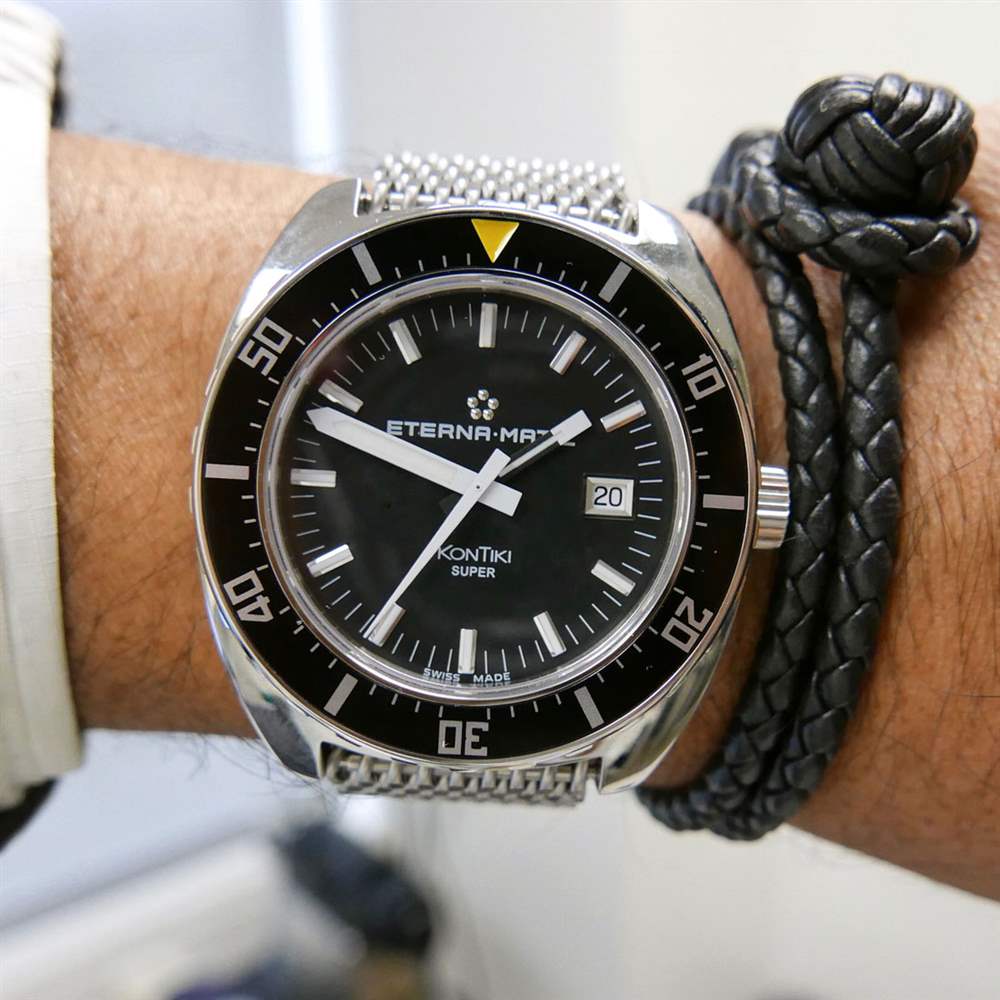我碰巧喜歡在游泳時帶著這只表去海灘。Eterna Heritage Super KonTiki 1973 在搭配潛水服??時也恰好看起來非常殺手。我喜歡擁有這樣具有獨特個性的手表的原因之一是它們能夠適應他們所處的環境。作為一款休閑的周末手表,Super KonTiki 與戶外、潛水、飛行、或駕駛手表。