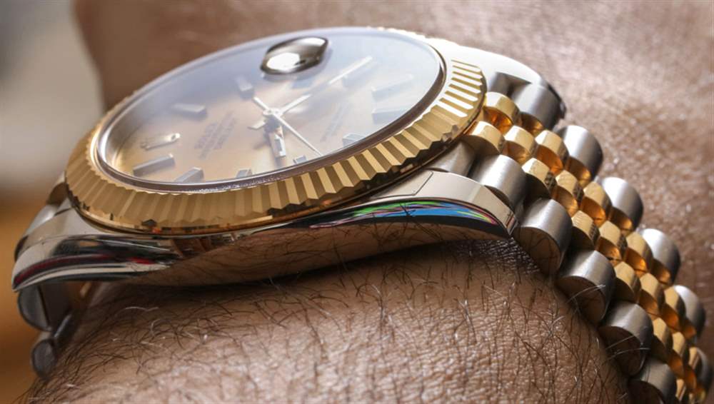 我選擇的那個實際上是勞力士用來在其網站上以及在 2016 年大部分時間在各種營銷材料中展示 Datejust 41 reference 126333 的“海報模型”。這個特殊的 Rolex Datejust 41 reference 126333 是 904L 鋼和 18k 黃金帶凹槽的 18k 黃金表圈和相配的“香檳”色表盤和易于閱讀的棒狀時標。它還使用了勞力士最新版本的廣受歡迎的 Jubilee 式手鏈,該手鏈利用了許多小鏈節。