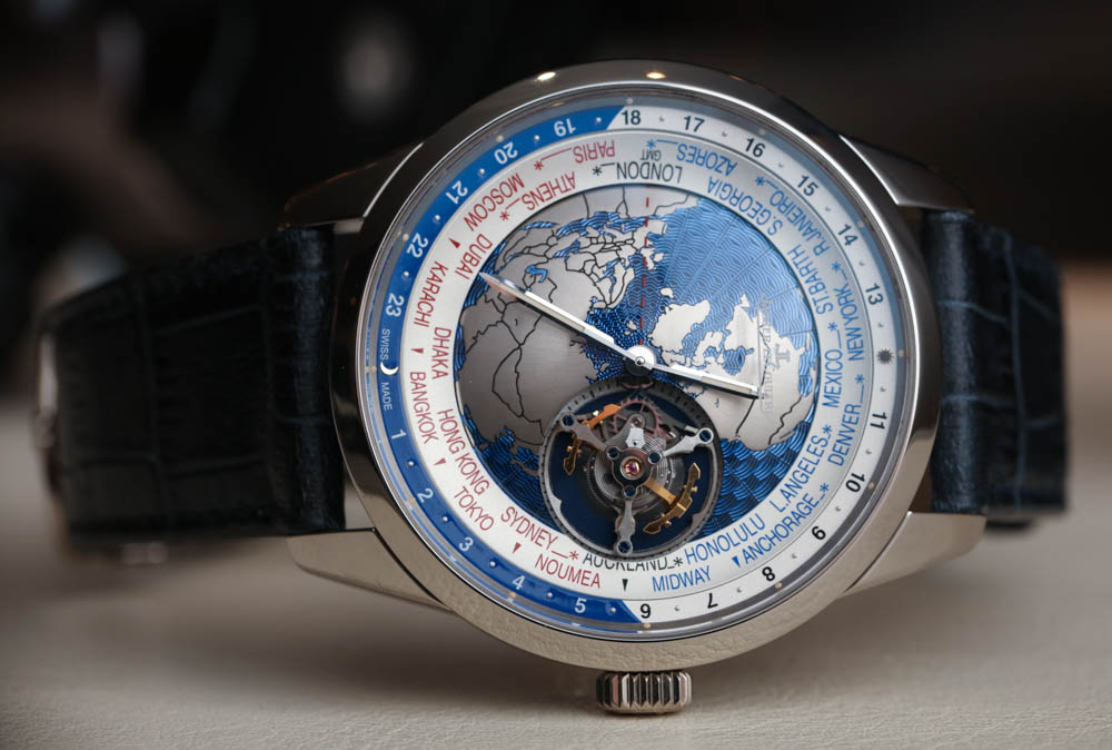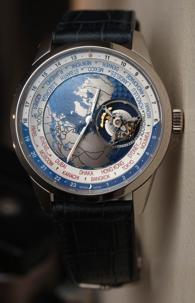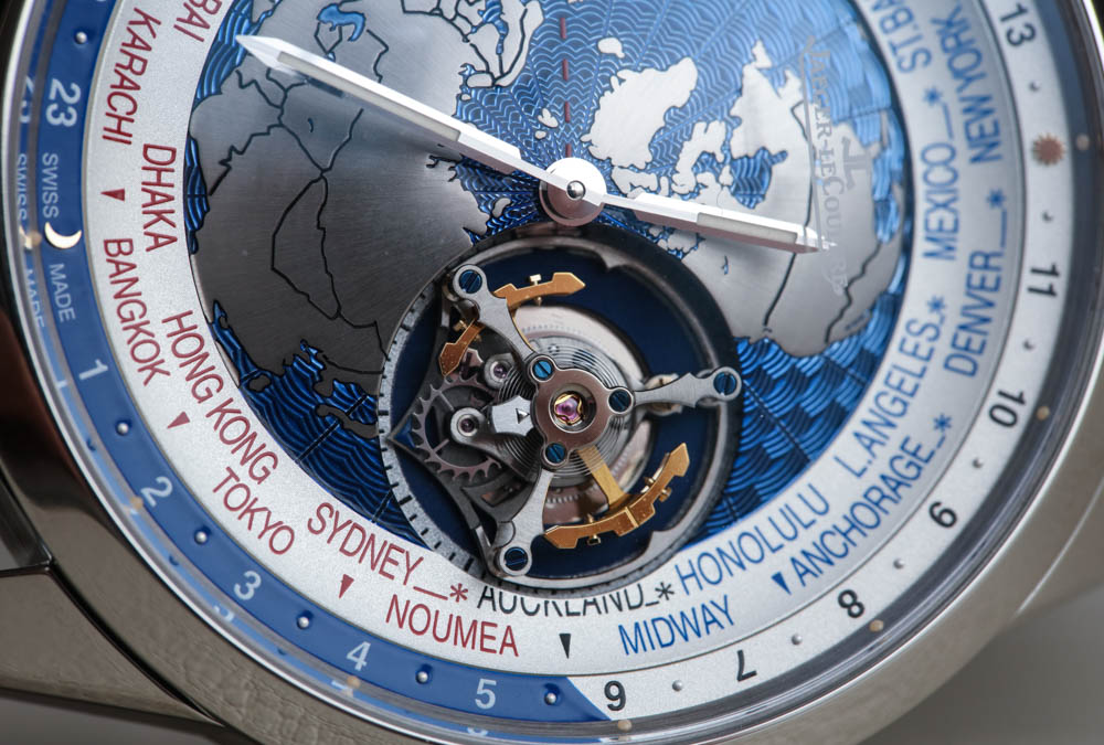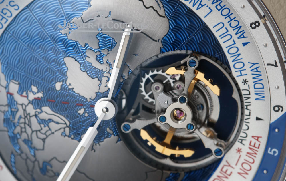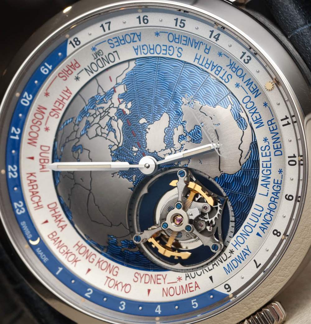 Jaeger-LeCoultre 聲稱在世界時間顯示盤中心的“地球表盤”上使用了扭索飾式機器雕刻來呈現海洋的外觀。它不是一個特別有用的表盤中心,但它在視覺上很有吸引力,這正是一些人認為的地球物理學,好吧,地球物理學。與此相同的其他 Geophysic 手表系列主題包括應用在表盤外圍的小發光點。