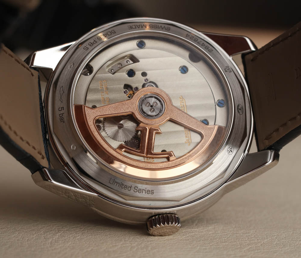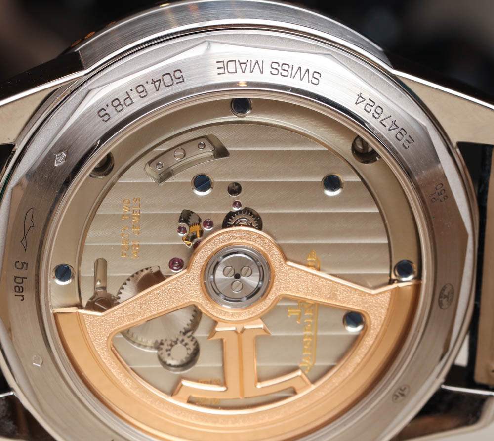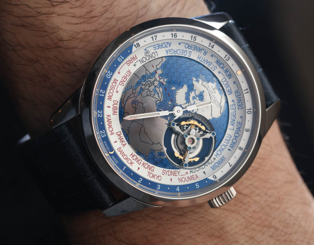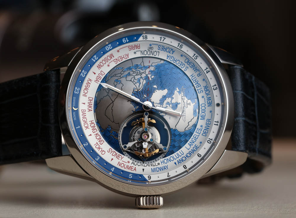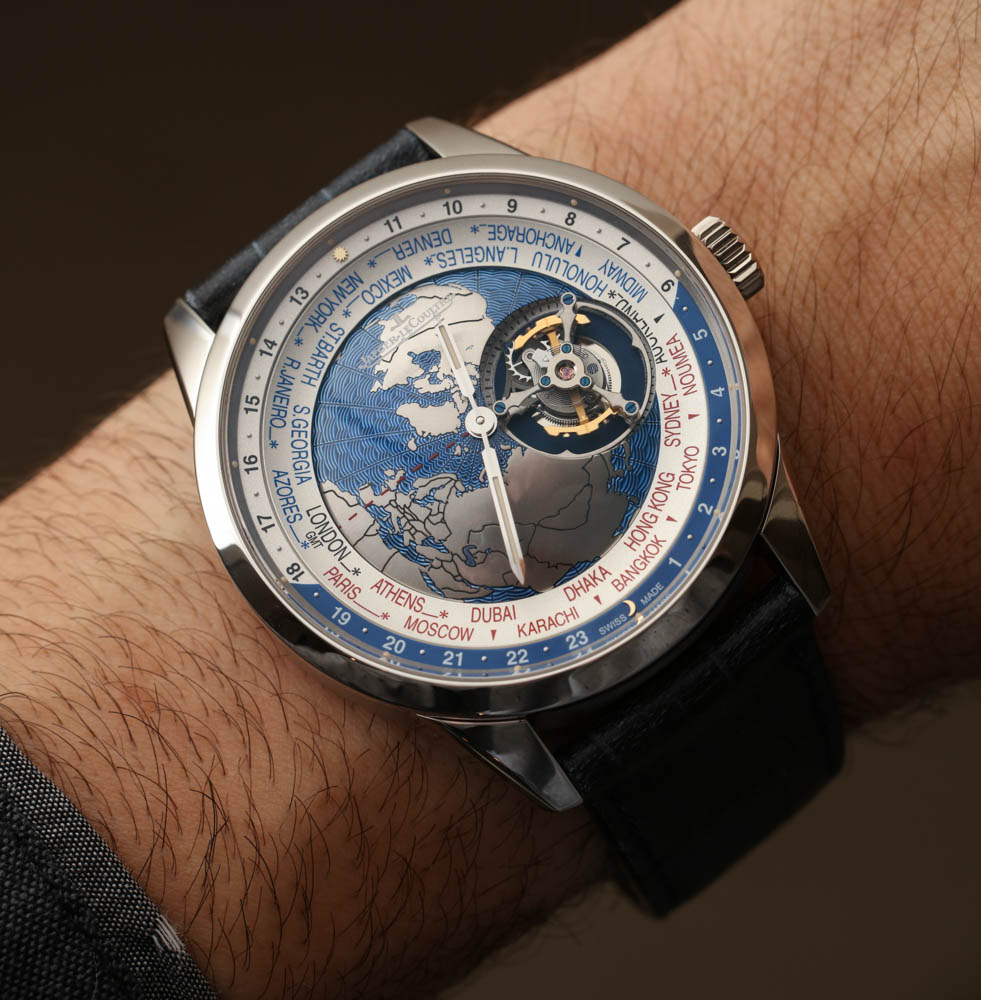 Jaeger-LeCoultre 聲稱在世界時間顯示盤中心的“地球表盤”上使用了扭索飾式機器雕刻來呈現海洋的外觀。它不是一個特別有用的表盤中心,但它在視覺上很有吸引力,這正是一些人認為的地球物理學,好吧,地球物理學。與此相同的其他 Geophysic 手表系列主題包括應用在表盤外圍的小發光點。