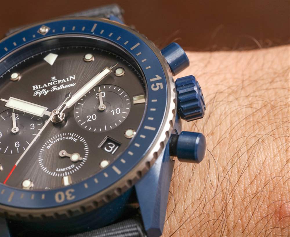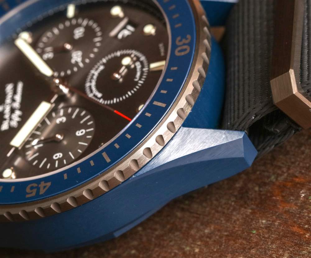 第一款五十噚深海飛返計時海洋承諾腕表采用灰色陶瓷表殼,搭配藍色表圈和表盤。寶珀五十噚深海飛返計時碼表 Ocean Commitment II 采用藍色陶瓷表殼和表圈,然后是金屬灰色表盤,有點顛倒了這個調(diào)色板。第一款和第二款 Ocean Commitment 都非常棒,但陶瓷手表愛好者顯然會涌向這款續(xù)集限量版。