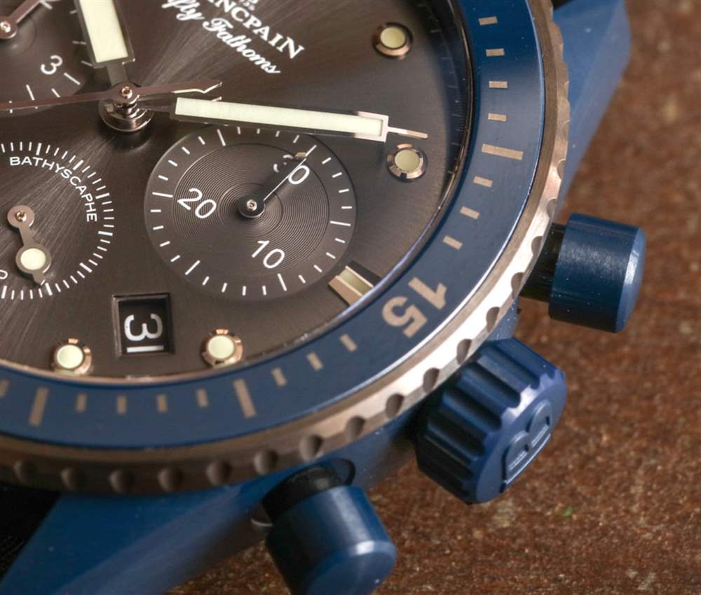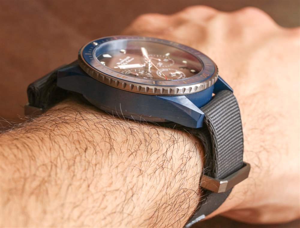 這是我戴過的第一個藍色陶瓷表殼(來自一個奢侈品牌),它看起來很棒——尤其是在有光澤的灰色調(diào)旁邊。在某些燈光下,藍色陶瓷看起來就像是黑色,但在光線充足的情況下,表殼材料的豐富藍色調(diào)就出來了。寶珀真的不能用藍色調(diào)淡一點,因為在生產(chǎn)方面它會使顏色變得太不穩(wěn)定。