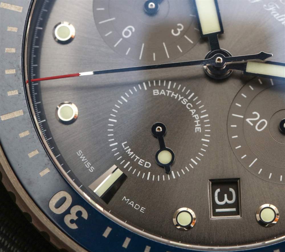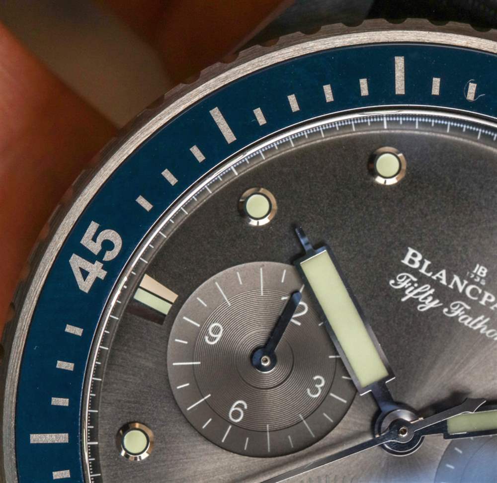也許表盤上唯一有爭議的元素是日期窗口。它確實有助于手表的銷售具有日期復雜功能。寶珀沒有將日期窗口設計為表盤,這也很好。然而,日期窗口是傾斜的,所以它的位置在 4 點到 5 點之間讀取有點奇怪。此外,日期盤本身是黑色的,比手表本身的“流星灰”表盤顏色要深一些。這真的沒什么大不了的,但這將是人們在其他漂亮的表盤設計中可能會抱怨的一件事。只需看一下表盤,您就會注意到表盤上的其他精彩細節(jié)。首先檢查小表盤的巧妙設計,以及大部分拋光的金屬框架時標。