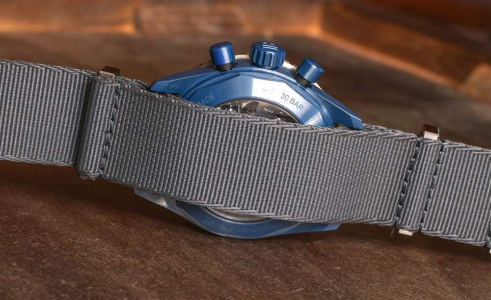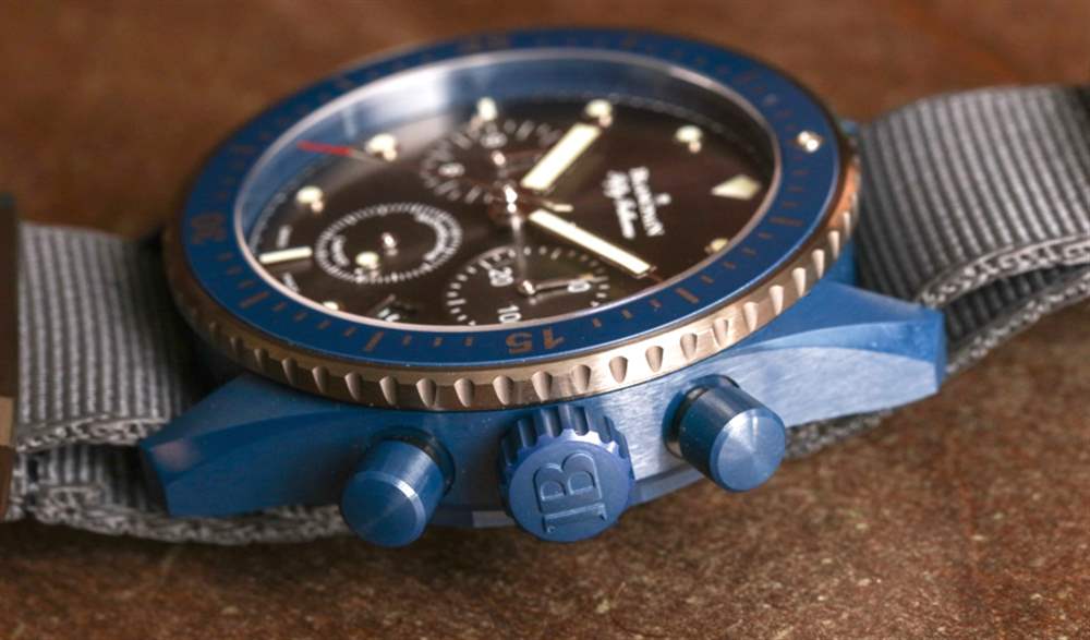 表盤周圍是平穩(wěn)操作的 120 次點擊、單向旋轉潛水員式表圈。外圈是鈦,液態(tài)金屬(與歐米茄共享的另一種技術)和藍色陶瓷作為表圈的其余部分。表冠和按鈕也采用藍色陶瓷制成——同樣精美。