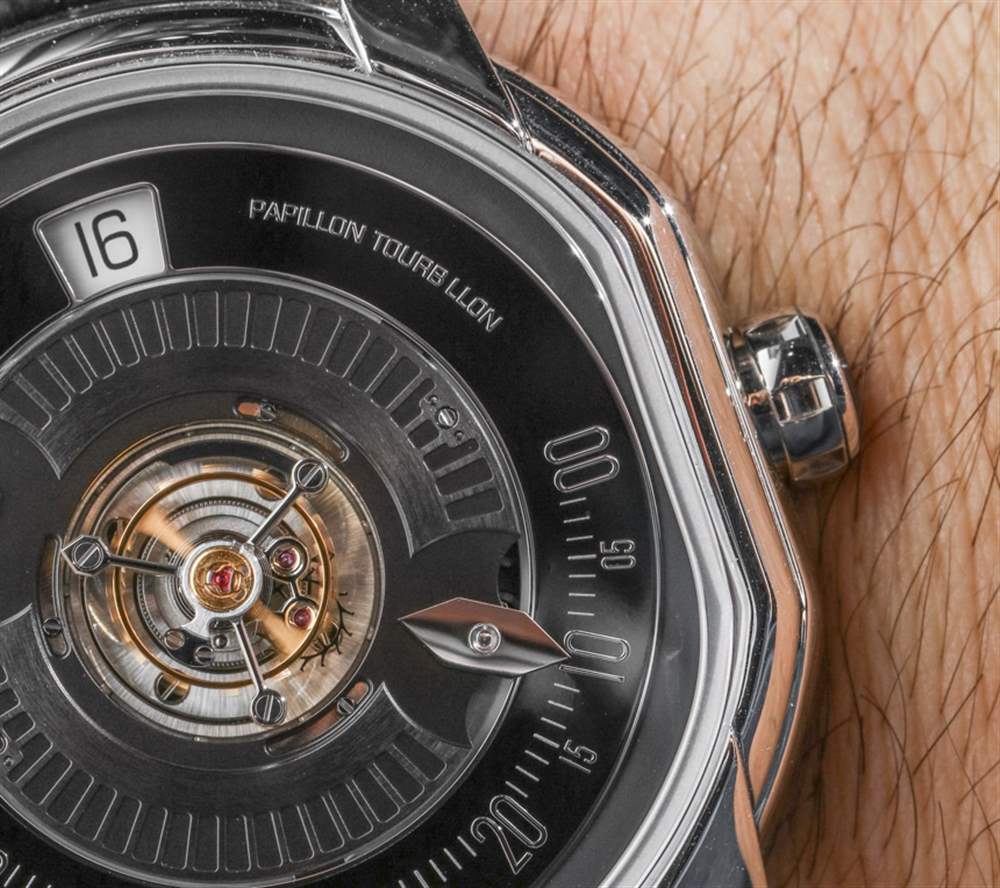 我一直提到 Urwerk 的原因是,雖然 Bulgari Papillon Tourbillon Central 的功能不同,但分針的操作有點相似。正如我之前所說,這不是第一款 Papillon 手表,因為它早于表盤上的寶格麗名稱,但這是我第一次記得它被移動到表盤外圍而不是正確的在中心。