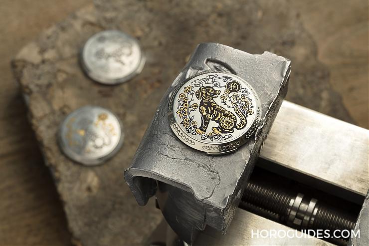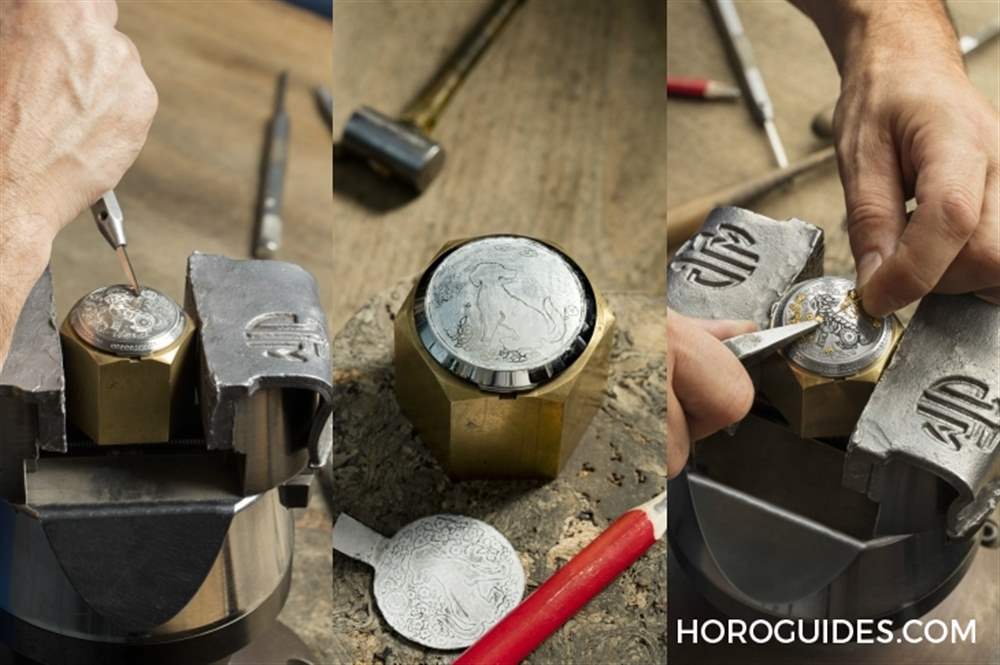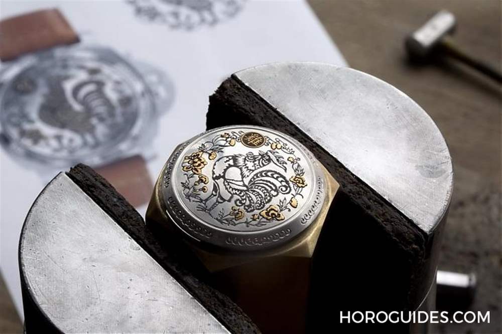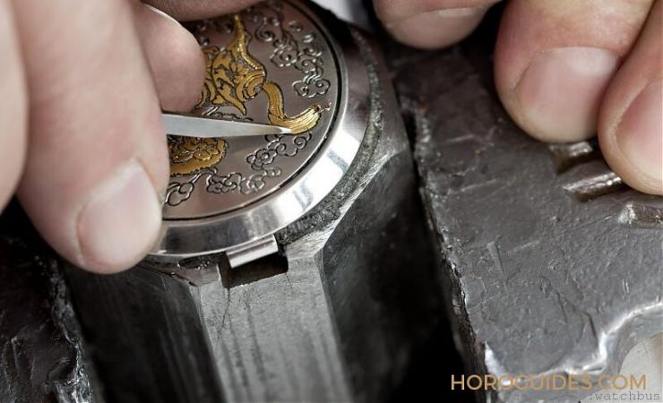 沛納海的表款向來就是給人相當(dāng)俐落、簡約、軍事風(fēng),而在生肖系列卻可以看到沛納海精雕細(xì)琢的義式工藝。在沛納海生肖表所采用的是義大利古老雕刻技法,首先功夫老練的雕刻師使用名為“sparsello”的特別工具在表蓋上雕刻出農(nóng)歷生肖圖形凹槽,再逐步將金絲嵌入拷捶、點綴精工細(xì)雕的生肖圖紋。