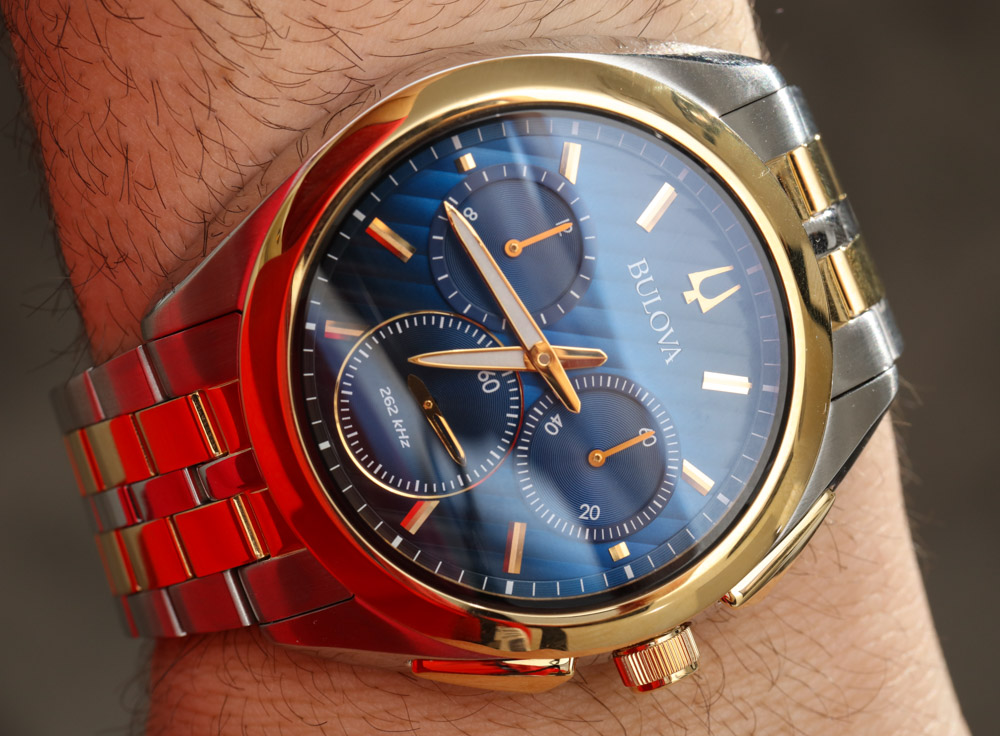 Bulova 所做的有趣的事情是從一開始就發(fā)布了外觀非常現(xiàn)代和更“保守”的 Bulova CURV 手表。正如我所提到的,“98A16”型號(hào)是最現(xiàn)代的,然后是外觀更經(jīng)典的“正裝”型號(hào),在 45 毫米寬的精鋼表殼(有些是黃色或玫瑰色)的表帶或表鏈上有五個(gè)版本金色調(diào))。這些傳統(tǒng)陽(yáng)剛但有些正式的 Bulova CURV 手表采用 45 毫米寬(9.7 毫米厚)表殼,參考型號(hào)為 97A124(699 美元)玫瑰金色調(diào)配鱷魚紋棕色皮革表帶,98A186(750 美元)精鋼表鏈搭配黑色表盤, 98A159(799 美元)雙色精鋼和黃金手鏈,98A160(799 美元)) 的雙色鋼和玫瑰金色表鏈,以及 97A125(799 美元)的全黃金表鏈表帶搭配表盤。