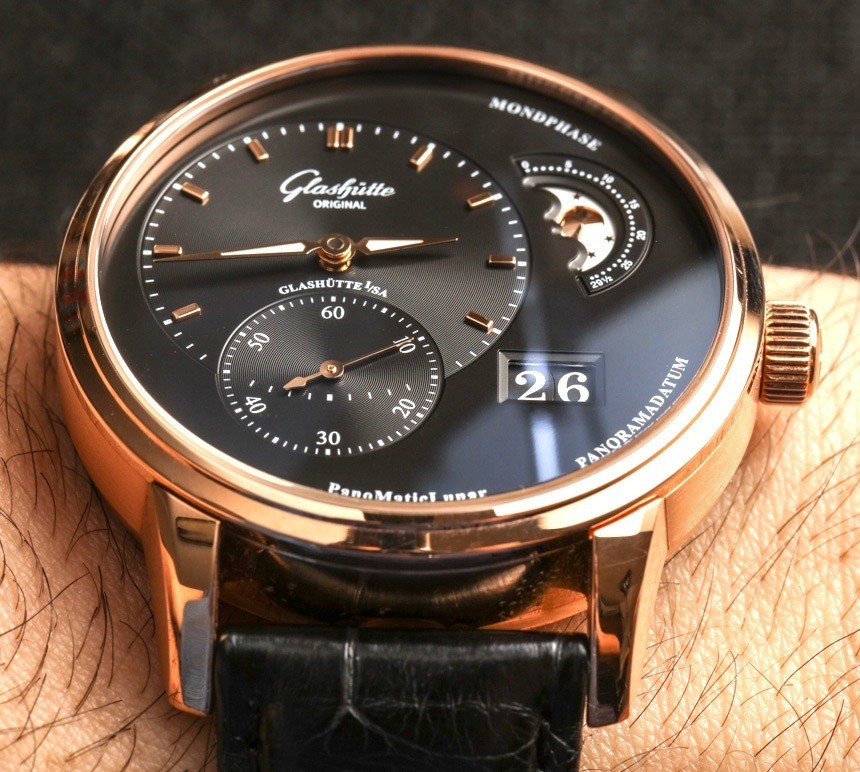在表盤上,功能明顯不對稱布局,但也符合邏輯且視覺平衡。表盤制作精美,清晰易讀,時針和分針甚至發光。我并不傾向于抱怨撥號文本,但考慮到這里字體的多樣性和一些文本的實用性較低,我覺得“Mondphase”和“Panoramadatum”只是不必要的。我不介意“PanoMaticLunar”型號名稱或“德國制造”,我覺得將它們放在表盤上會更好。