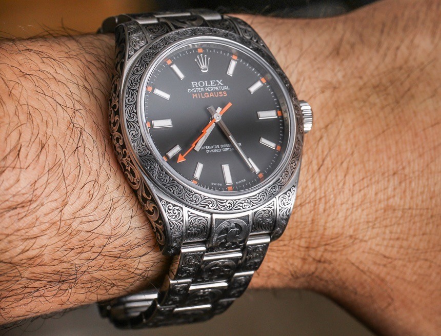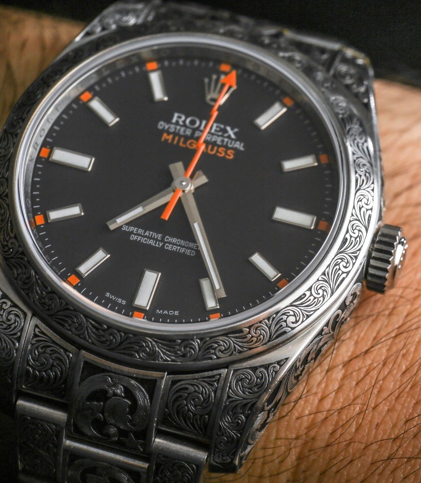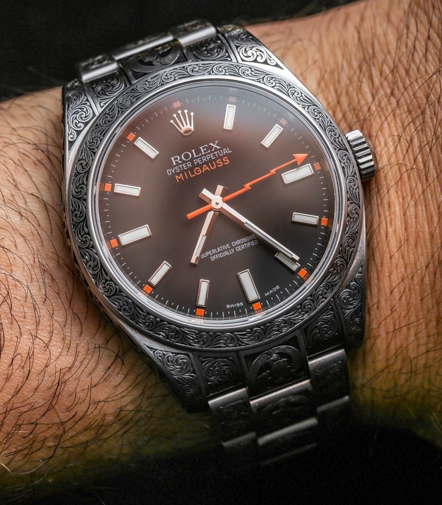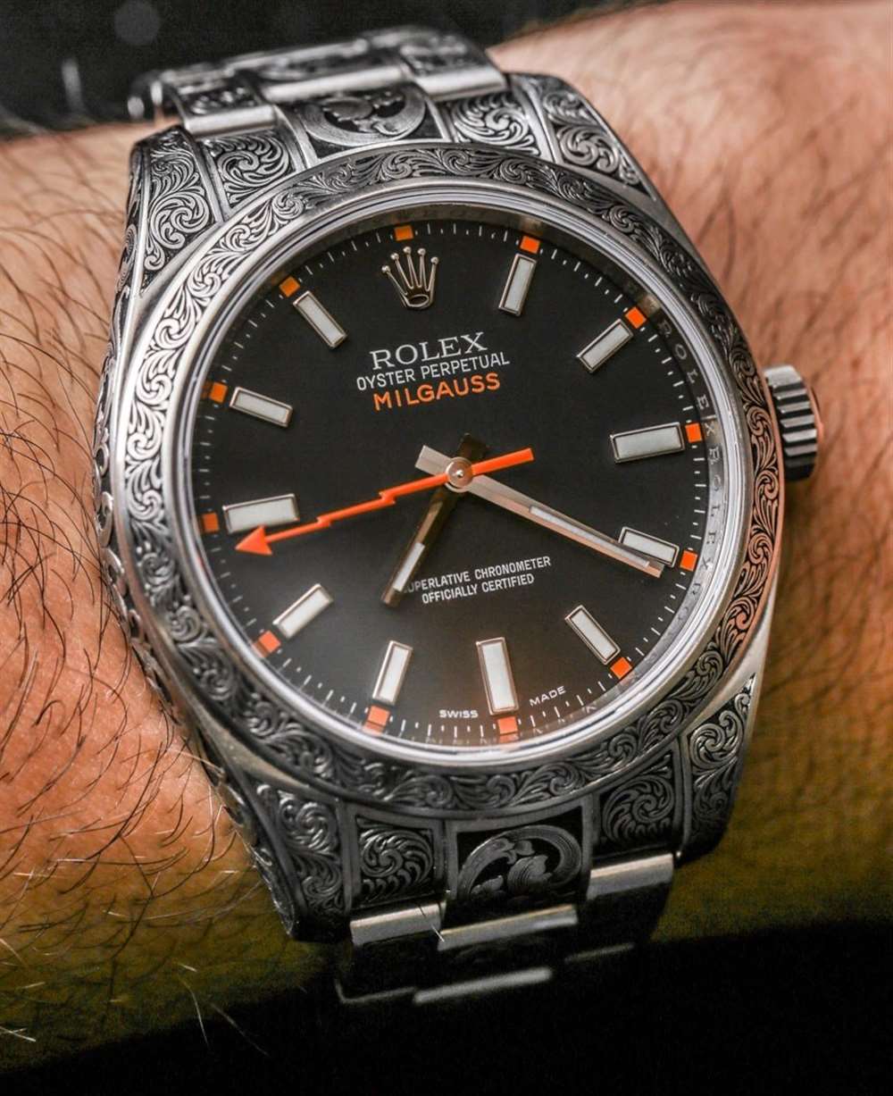 我個人喜歡藝術的完整性,以及它如何將如此具有普遍吸引力的東西變得更加有趣。雕刻勞力士并不能讓它變得更好,而是讓它變得獨一無二。這意味著做這件事的人,以及穿它的人,都需要有強烈的個性和穿上他們知道不是每個人都會喜歡的東西的愿望。我向我展示過這塊雕刻過的勞力士 Milgauss 116400 的每個人都同意這件作品非常出色,但有些人并不覺得它有吸引力。當然,這是有道理的,因為這是一種高度程式化的外觀(有點像 MadeWorn),不會吸引所有人。話雖如此,如果你喜歡槍式手工雕刻的外觀,我根本看不到你對這款時計感到失望。