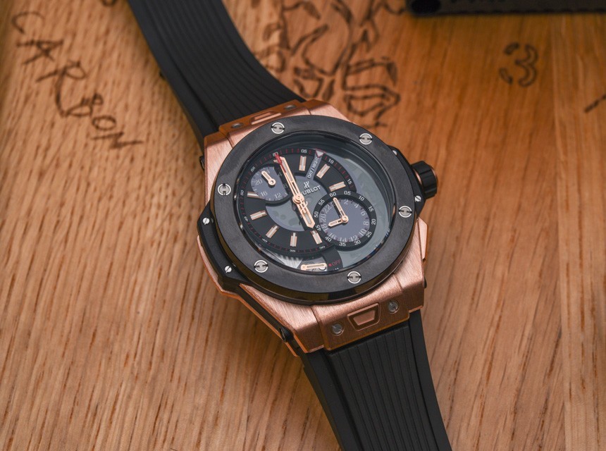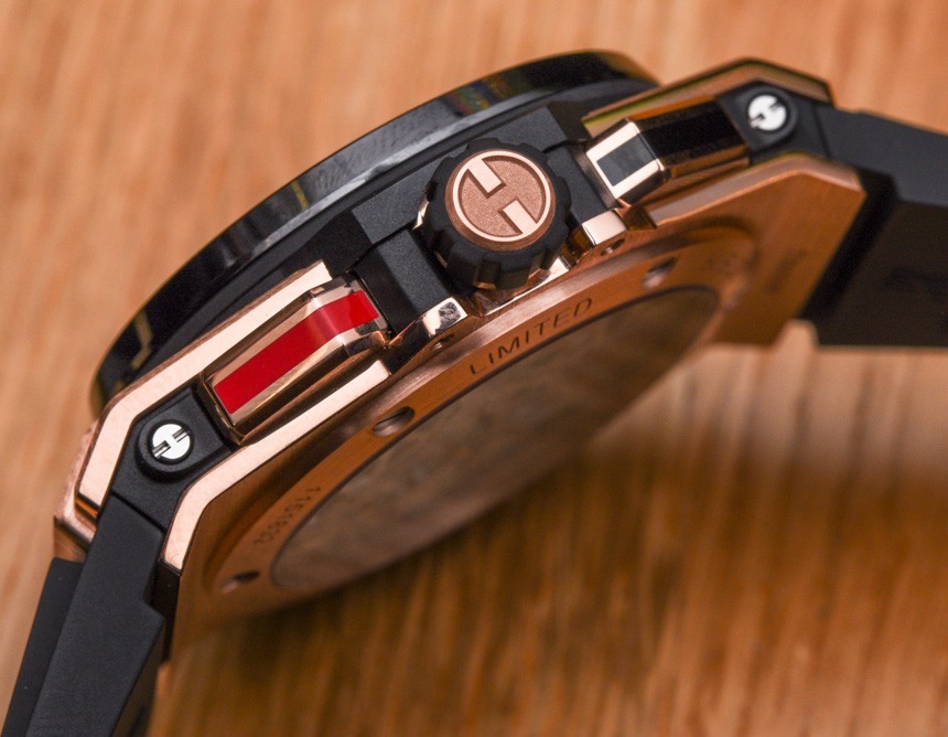 在45mm寬處,可以清楚地看到這是宇舶表在2013年推出的新款Big Bang 45表殼。然而,Hublot 為這種情況使用了獨特的推動器設計。推動器更加微妙,與表殼齊平,這很有趣。Hublot Big Bang Alarm Repeater 提供兩個版本——每個版本都有黑色陶瓷表圈。型號 403.NM.0123.RX 配備鈦金屬表殼,而型號 403.OM.0123.RX 配備 18k 王金(紅金)表殼。