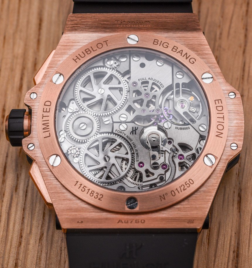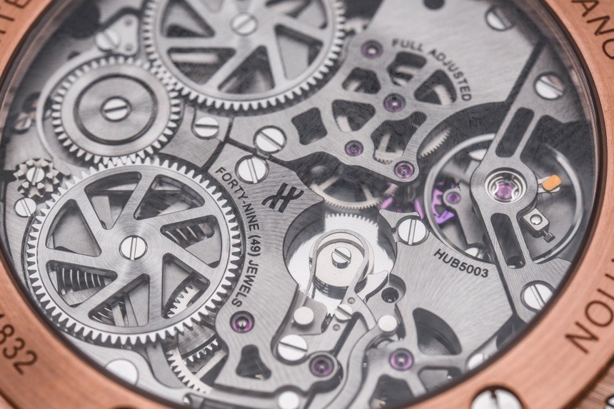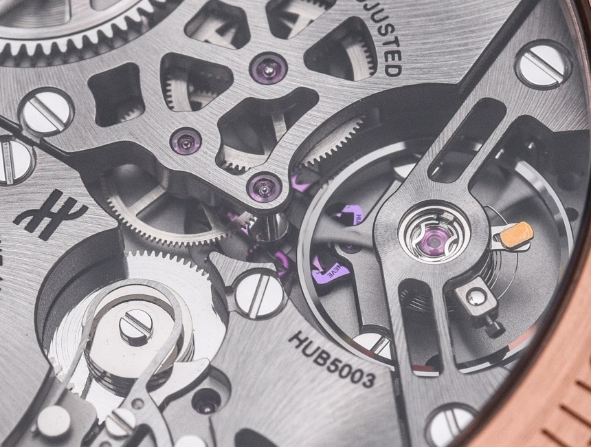 HUB5003機芯采用硅質擒縱系統,動力儲存72小時,包括帶24小時指示的時間、用于設置未來24小時鬧鐘時間的24小時表盤,以及一個警報并發癥的開/關開關。此外,表盤由半透明材料(幾層彩色藍寶石水晶)制成,即使 Hublot Big Bang Alarm Repeater 沒有所謂的鏤空表盤,也可以瞥見下面的機芯。