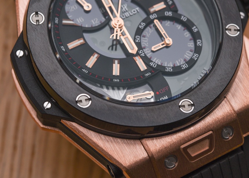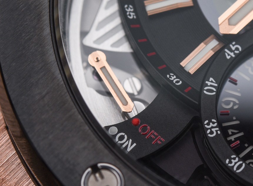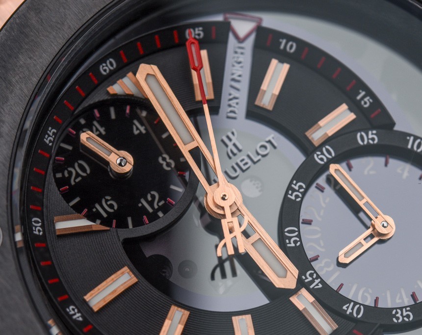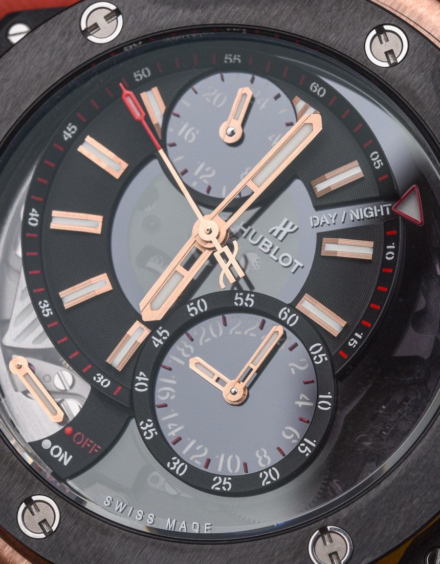 關于 Hublot Big Bang Alarm Repeater 表盤,您首先會注意到的一件事是主表盤有點偏離中心。這可能是我所知道的唯一一款像這樣的 Hublot Big Bang 手表——而且它可能是唯一一款。這可能看起來是一件小事,但它賦予了這款手表在品牌中完全獨特的個性,盡管表殼顯然是現代的 Big Bang。