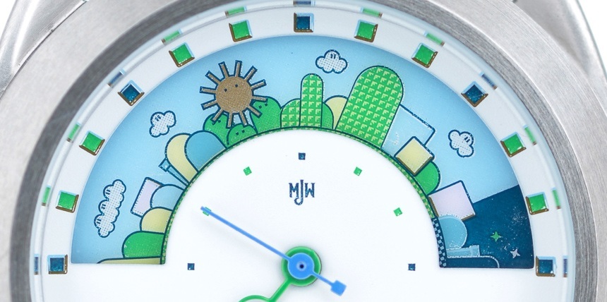 Mr. Jones Watches Sun and Moon Miyamoto 本質上是一款手表,帶有一個用于分秒的小表盤,以及一個出現在窗口中的圓盤,每 24 小時旋轉一圈。這張光盤就是您讀取小時數的方式。Mr. Jones Watches 制作了多款主題各異的 Sun 和 Moon 腕表,最新推出的是帶有卡通超級馬里奧兄弟世界的 Miyamoto,而且其中很多都是限量版。
