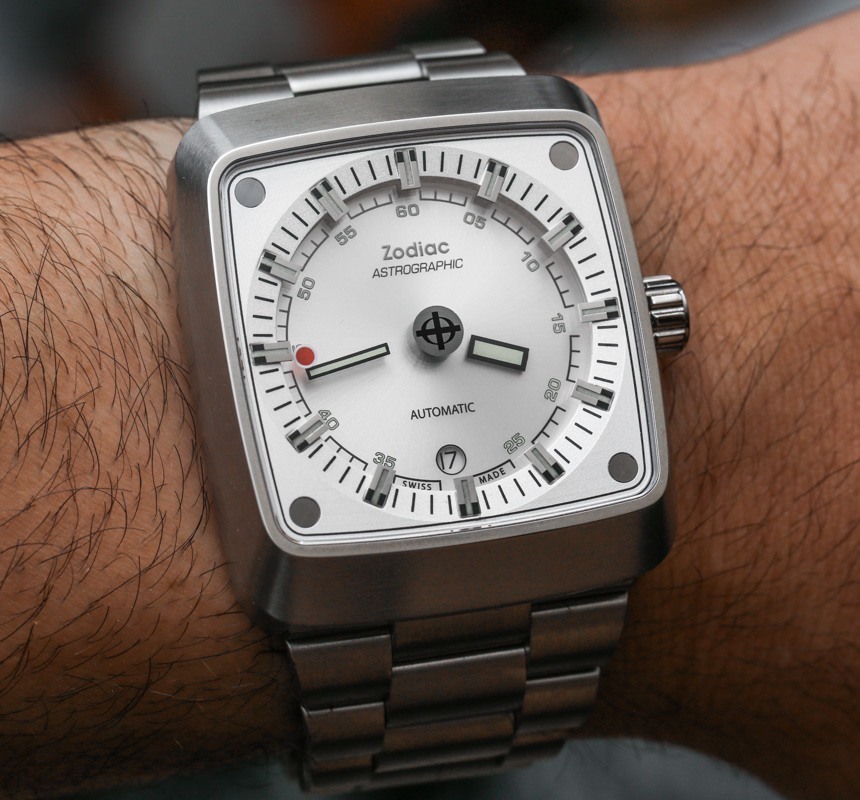 戴在手腕上,十二生肖星象表不是小表,而是佩戴舒適。“垂直電視屏幕”樣式的外殼寬 39 毫米,高 45 毫米。表殼也有 12 毫米厚——但視覺上看起來更厚一些。鋼制表殼和表鏈也很有分量——由厚鋼鏈制成。我一直是錐形手鐲的粉絲,我贊賞 Zodiac 保留了 Zodiac Astrographic 風格的這一重要元素——這也有助于佩戴舒適。那些尋求不太保守但又讓人一眼就熟悉的設計的人會喜歡 Zodiac Astrographic,其核心主題和概念出奇地經久不衰。