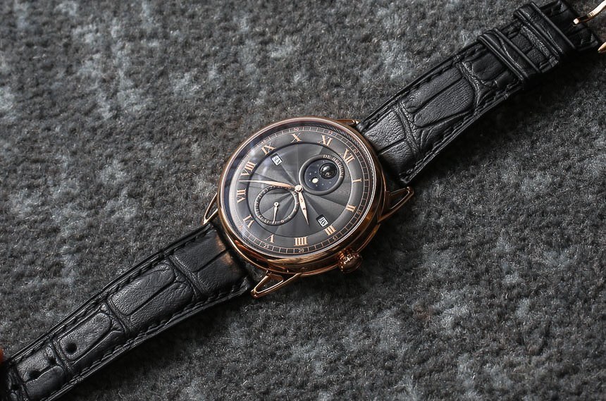 日歷數(shù)據(jù)通過六點鐘位置的日期子表盤和相對的星期和月份窗口顯示。這些窗口采用其他 De Bethune DB25QP Perpetual Calendar 手表較淺的表盤顏色設(shè)計,白色與表面的較深顏色形成鮮明對比。這實際上并沒有打擾我,因為它使窗口更清晰,但在一個完美的世界中,De Bethune 可能使光盤具有匹配的棕色金屬色。