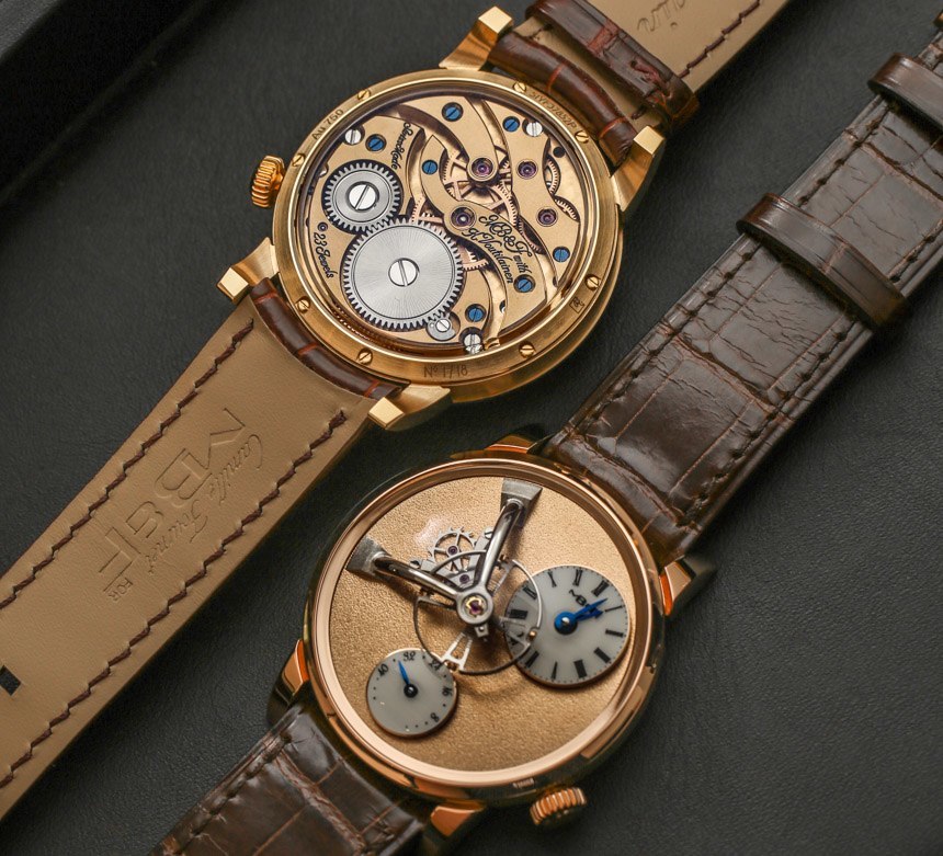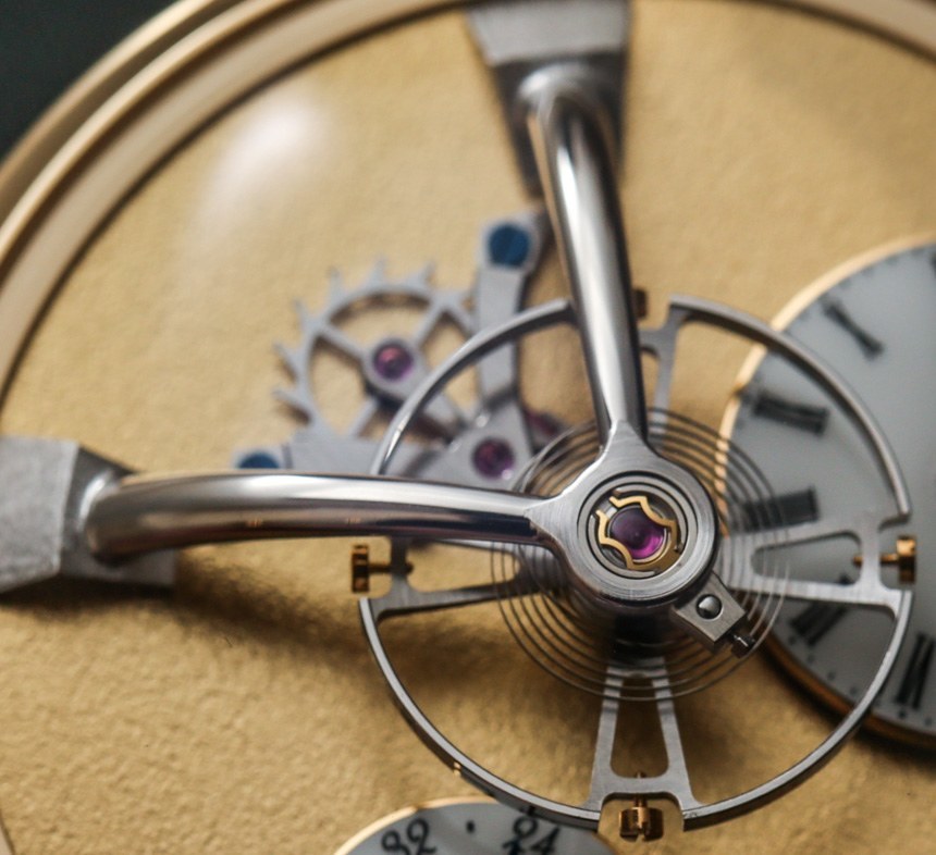 機(jī)芯以 18,000 次/小時(shí)(2.5 赫茲)的頻率運(yùn)行,表盤中央有一個(gè) 14 毫米寬的大擺輪,并通過(guò)高架橋固定在主表盤上方。機(jī)芯手動(dòng)上鏈,動(dòng)力儲(chǔ)存 45 小時(shí)。手表的表面提供了很大的空間來(lái)享受磨砂表面,6 點(diǎn)鐘位置有一個(gè)動(dòng)力儲(chǔ)存指示盤以及一個(gè)偏心表盤。