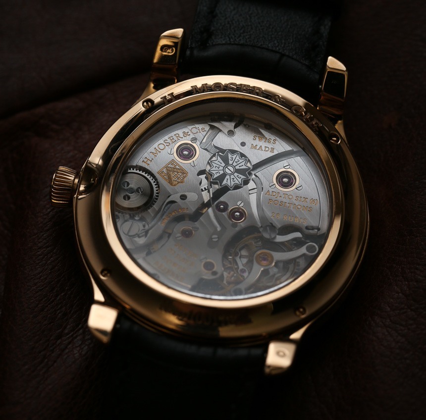 HMC 341 的精加工非常好,我喜歡細節,例如大尺寸合成紅寶石周圍的金套筒。從表殼后部看到的機芯表面也是萬年歷復雜功能的閏年指示器所在的位置。我特別喜歡這種放置選擇,因為這是萬年歷的必要元素,但不是您需要定期查看的東西。事實上,大多數其他萬年歷手表都竭盡全力“隱藏”閏年指示器,以免影響整體設計。將這個指示器放在表背上,只是H. Moser & Cie.設計感十足的眾多小物件之一。