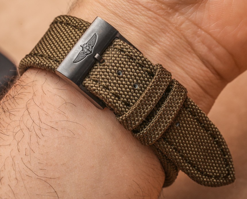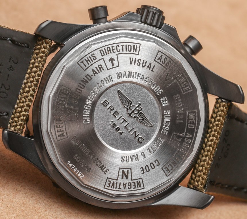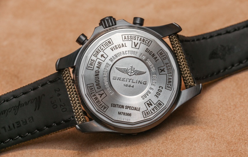 Breliting Chronospace Military 可能會推出其他顏色版本。這意味著白色與陳年風格的流明,以及其他可能的變化。目前,帶奶油色夜光的標準黑色表殼配有多種表帶選項,包括這條綠色織物表帶和一條黑色織物表帶。您也可以將 Breliting Chronospace Military 手表戴在手鏈上——但前提是您喜歡黑色的米蘭式手鏈。另請注意手表的酷炫底蓋。