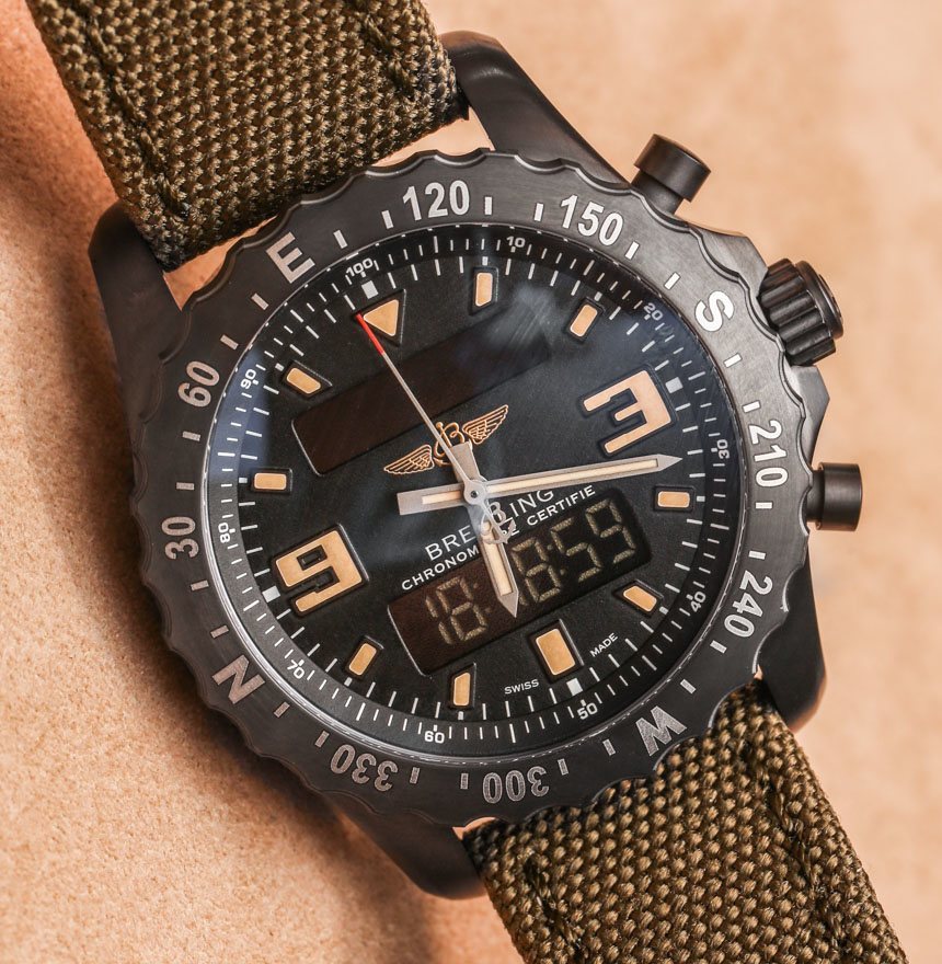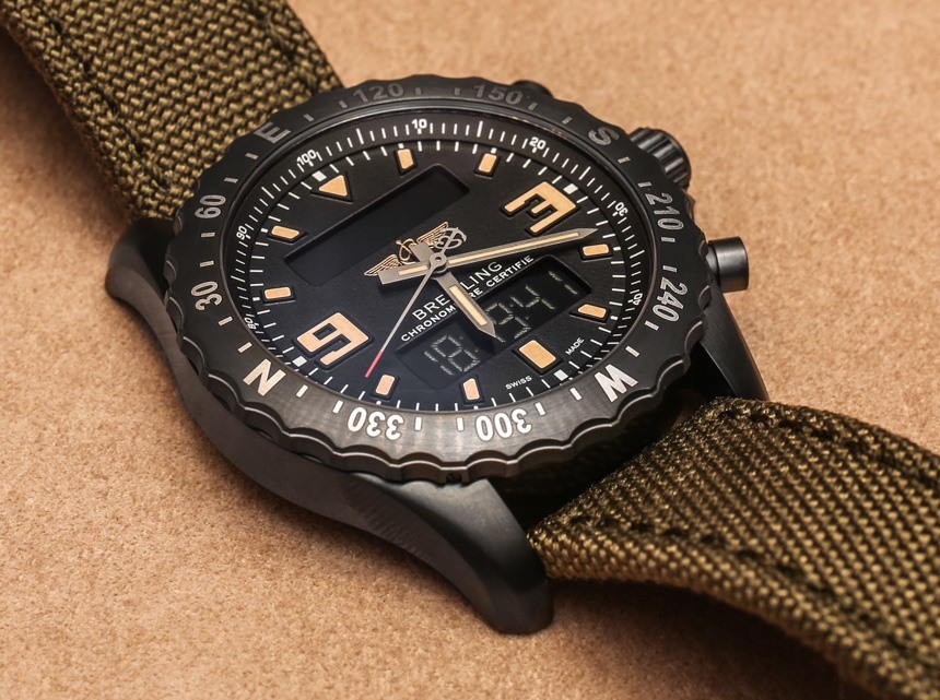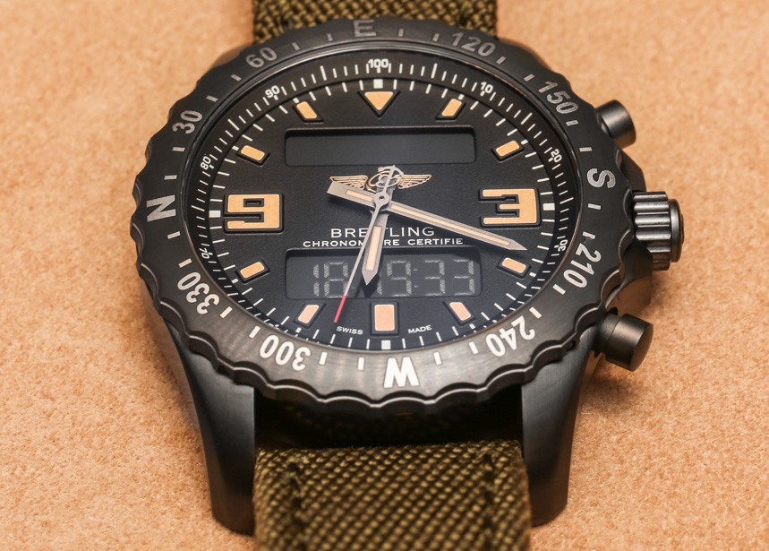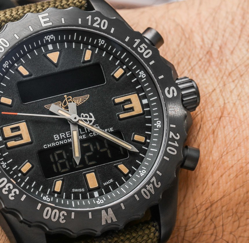 關于 Breiting Chronospace Military 的更多好消息是,與其他 Chronospace 型號相比,Breitling 通過調低表盤來美化表盤。將其與標準Breitling Chronospace 手表的表盤進行比較(此處為實際操作)。這意味著更小的 3 點鐘和 9 點鐘小時指示器,更簡單的啞光黑色表盤,以及放棄內部旋轉滑尺表圈(在我看來這真的只適用于 Navitimer)以實現簡單的分鐘軌道。Breliting Chronospace Military 周圍的表圈現在帶有羅盤指示器,用于導航目的。