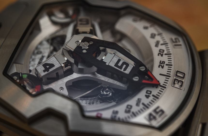 理論上,暫停自動擺陀有助于保護機械機芯免受沖擊。我想這是真的,但這不是一款運動手表,盡管它非常現代和酷。同樣的理論適用于通過降低旋轉速度來減慢自動轉子的速度。在某些情況下,您是在保護機芯。這實際上只是一種調整和玩手表的方式。Urwerk 非常喜歡他們的時計具有互動性并讓佩戴者有事可做的想法——因此能夠擾亂上鏈系統的功能。該機芯也恰好以 4Hz 運行。