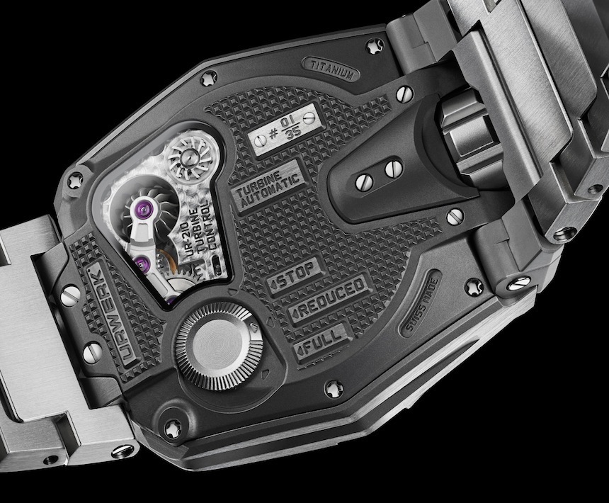 Urwerk UR-210S 內部裝有 Urwerk 自制口徑 UR-7.10 自動機芯。由于自動陀是隱藏的,如果不是手表底部的旋轉渦輪機,很難一眼就知道機芯是自動的。雖然 Urwerk UR-210S 表殼的主要部分是鋼制的,但表殼底部是鈦合金的。幾個窗口顯示了連接到旋轉轉子的渦輪機。還有一個小開關。這個開關允許用戶完全停止自動轉子的旋轉,或者“減少它”。